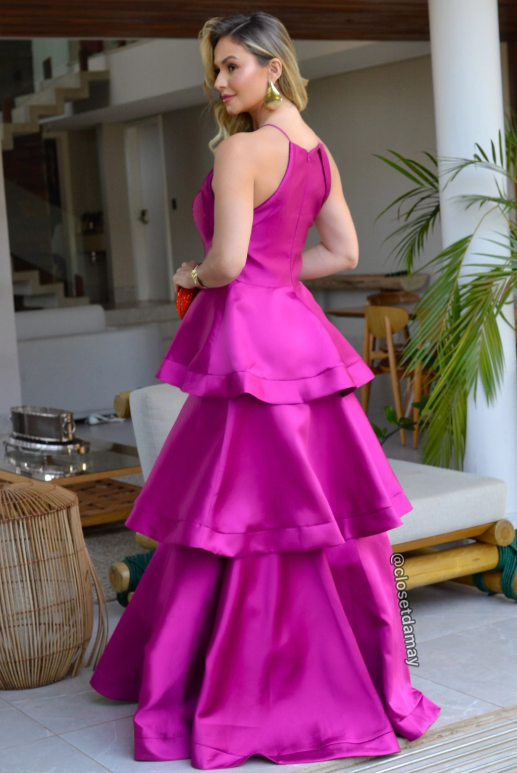 Vestido de festa longo em zibeline com saia em camadas e alpças finas.