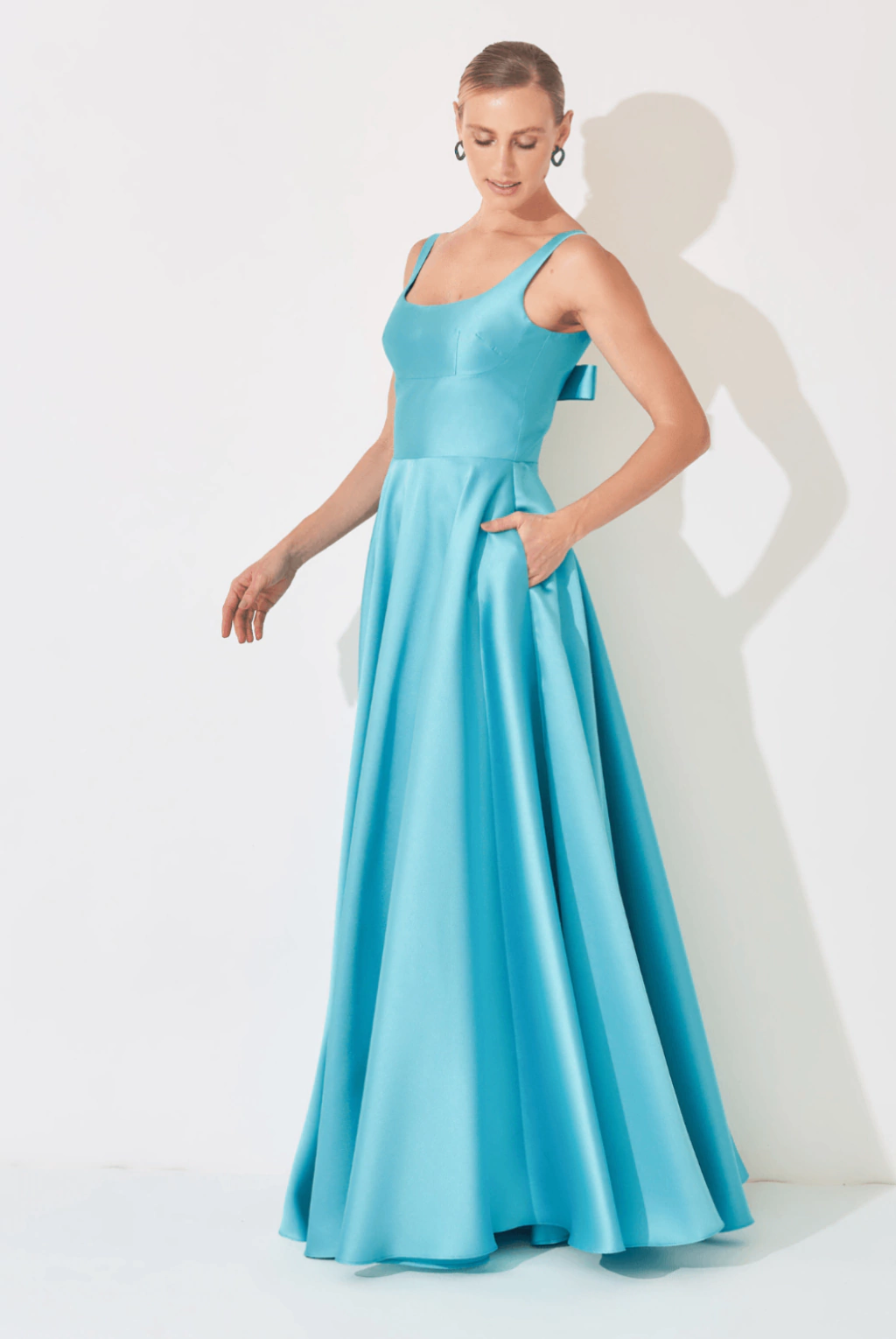 Vestido de festa longo em Zibeline, decote arredondado com alças largas, busto estruturado, saia rodada com bolsos, decote profundo nas costas com laço removível.