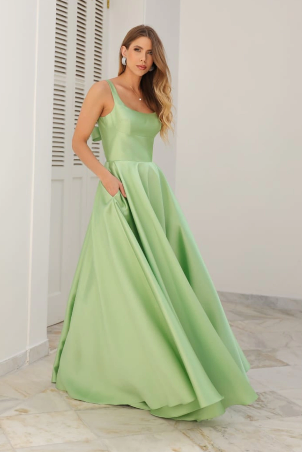 Vestido de festa longo em Zibeline, decote arredondado com alças largas, busto estruturado, saia rodada com bolsos, decote profundo nas costas com laço removível.