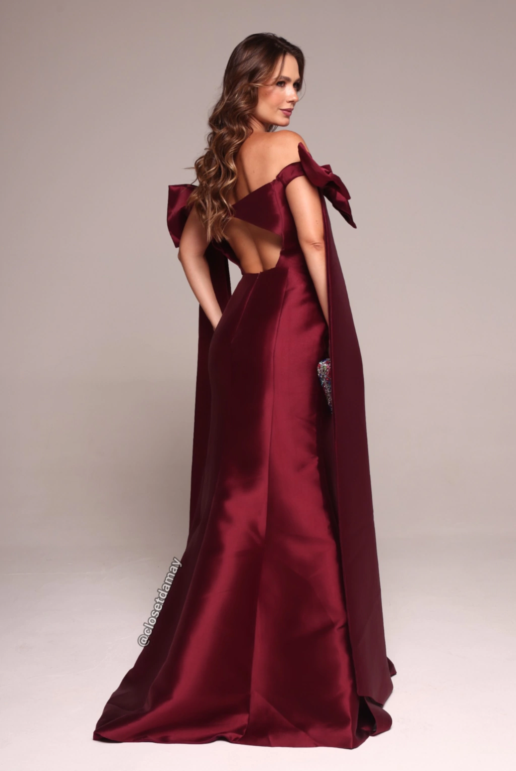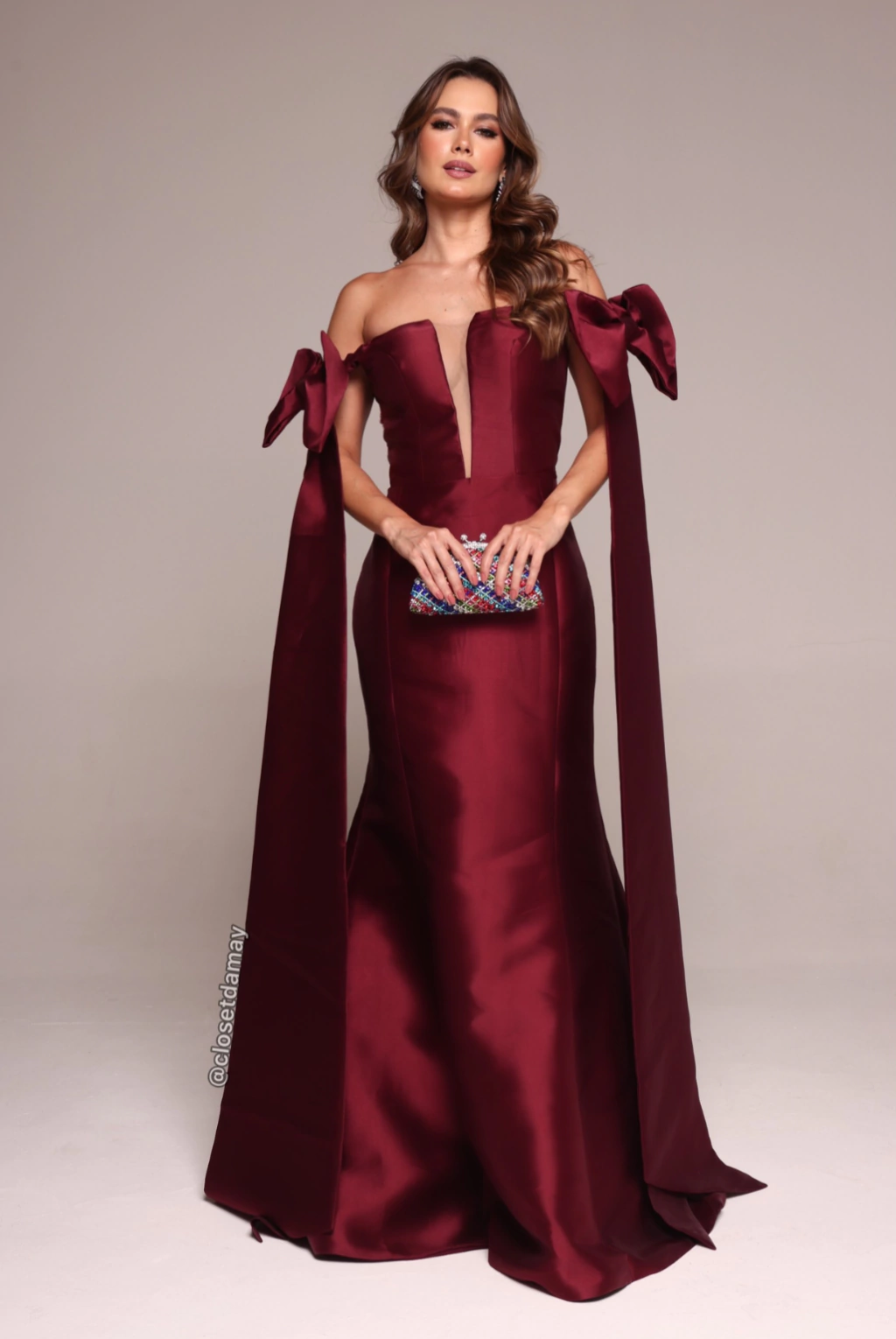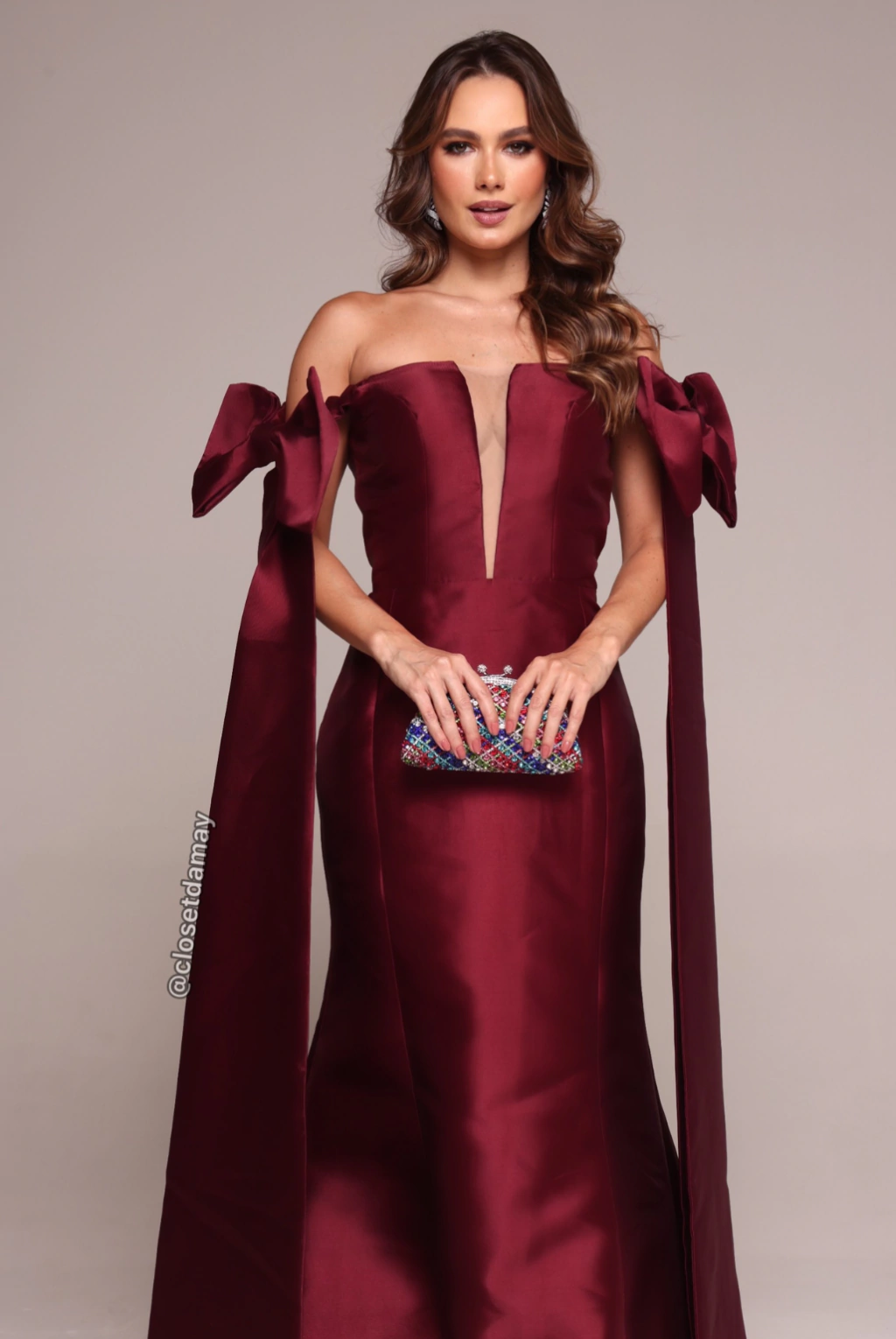 Vestido de festa longo em zibeline, com detalhe de laço na alça. Possui bojo, forro e zíper.