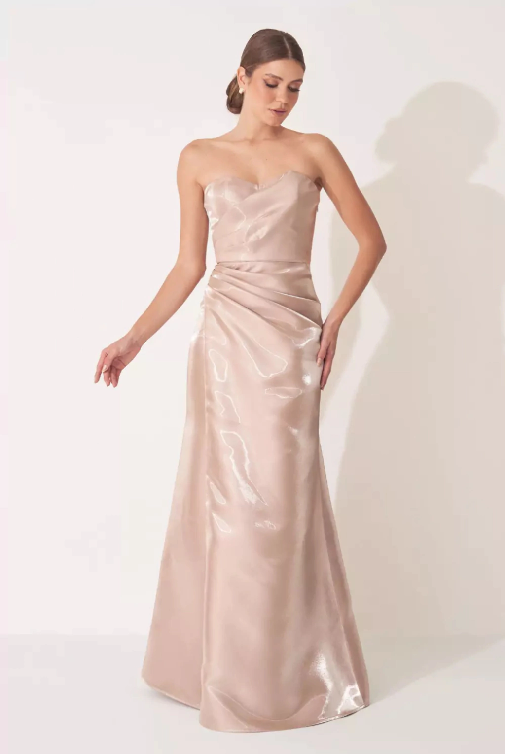 Vestido de festa longo, em zibeline glow, tomara que caia e drapeado lateral - Dourado