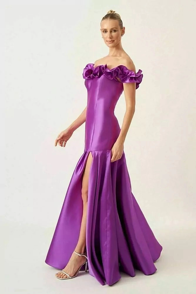 Vestido de festa longo, em zibeline, ombro a ombro, possui fenda lateral com babado estruturadono busto. Possui bojo, forro e zíper.