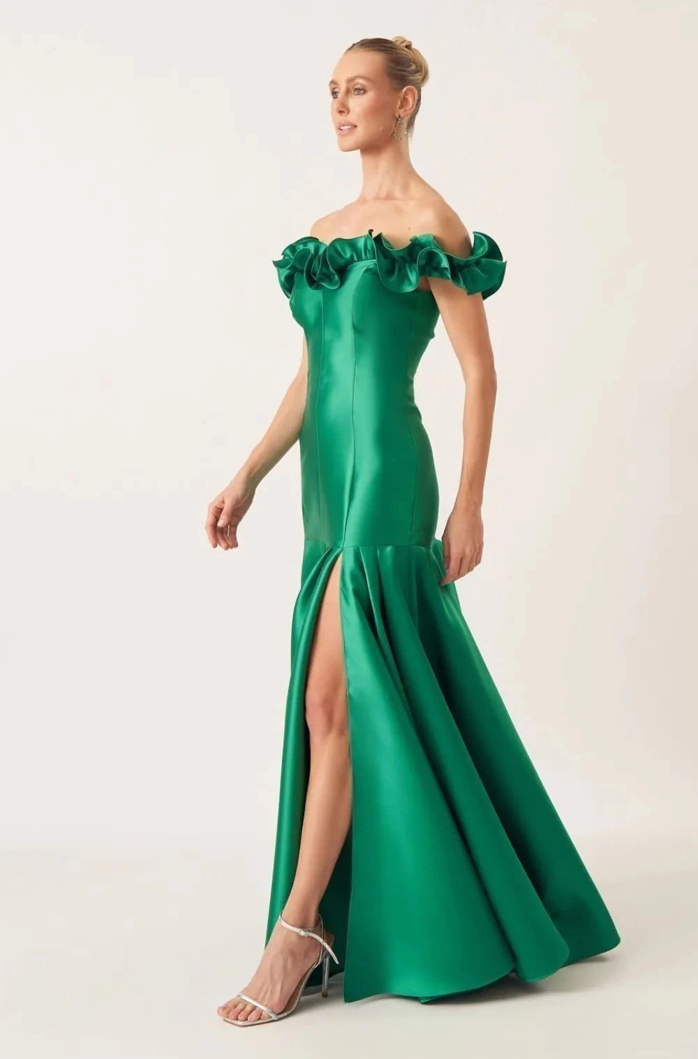 Vestido de festa longo, em zibeline, ombro a ombro, possui fenda lateral com babado estruturado no busto. Possui bojo, forro e zíper.