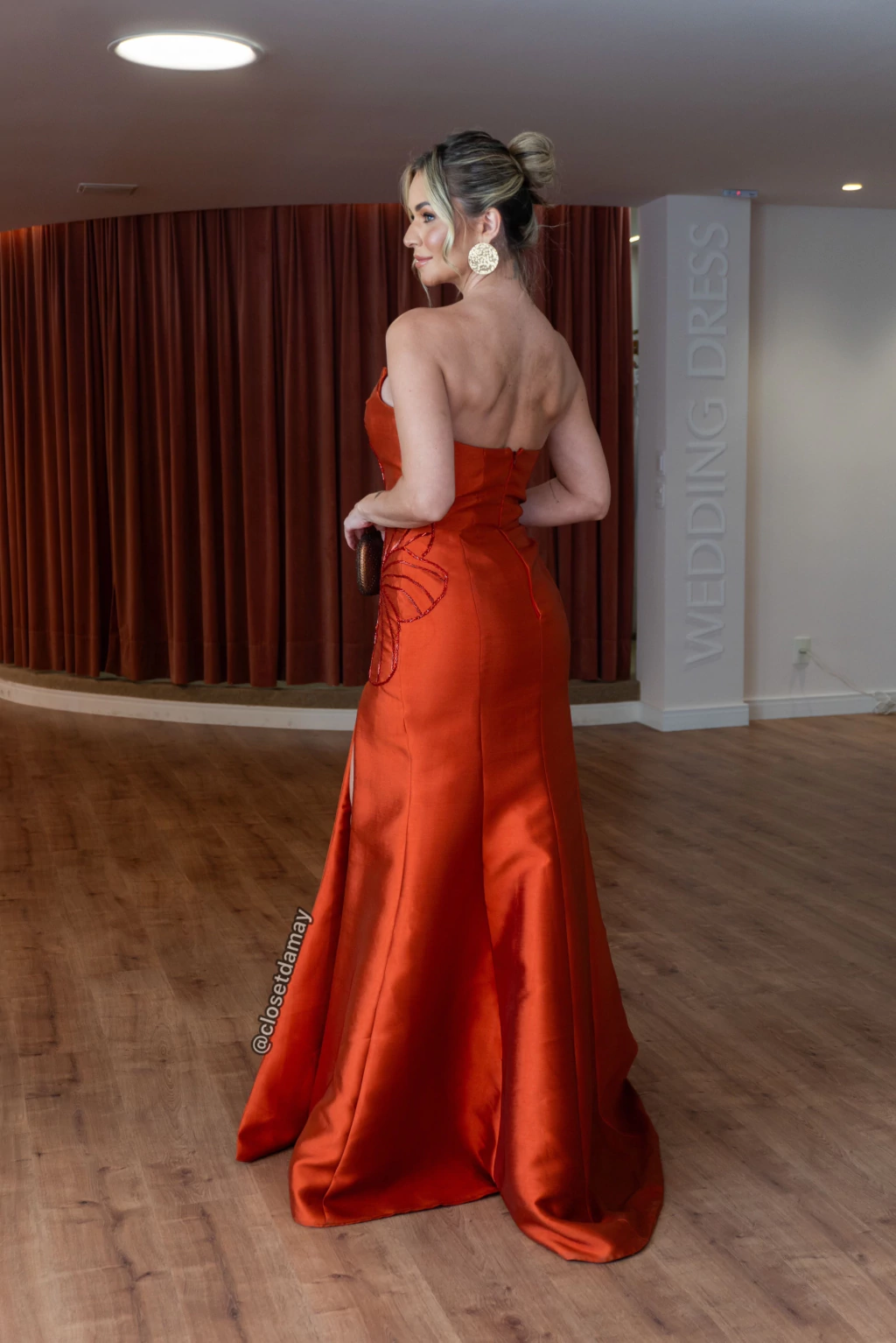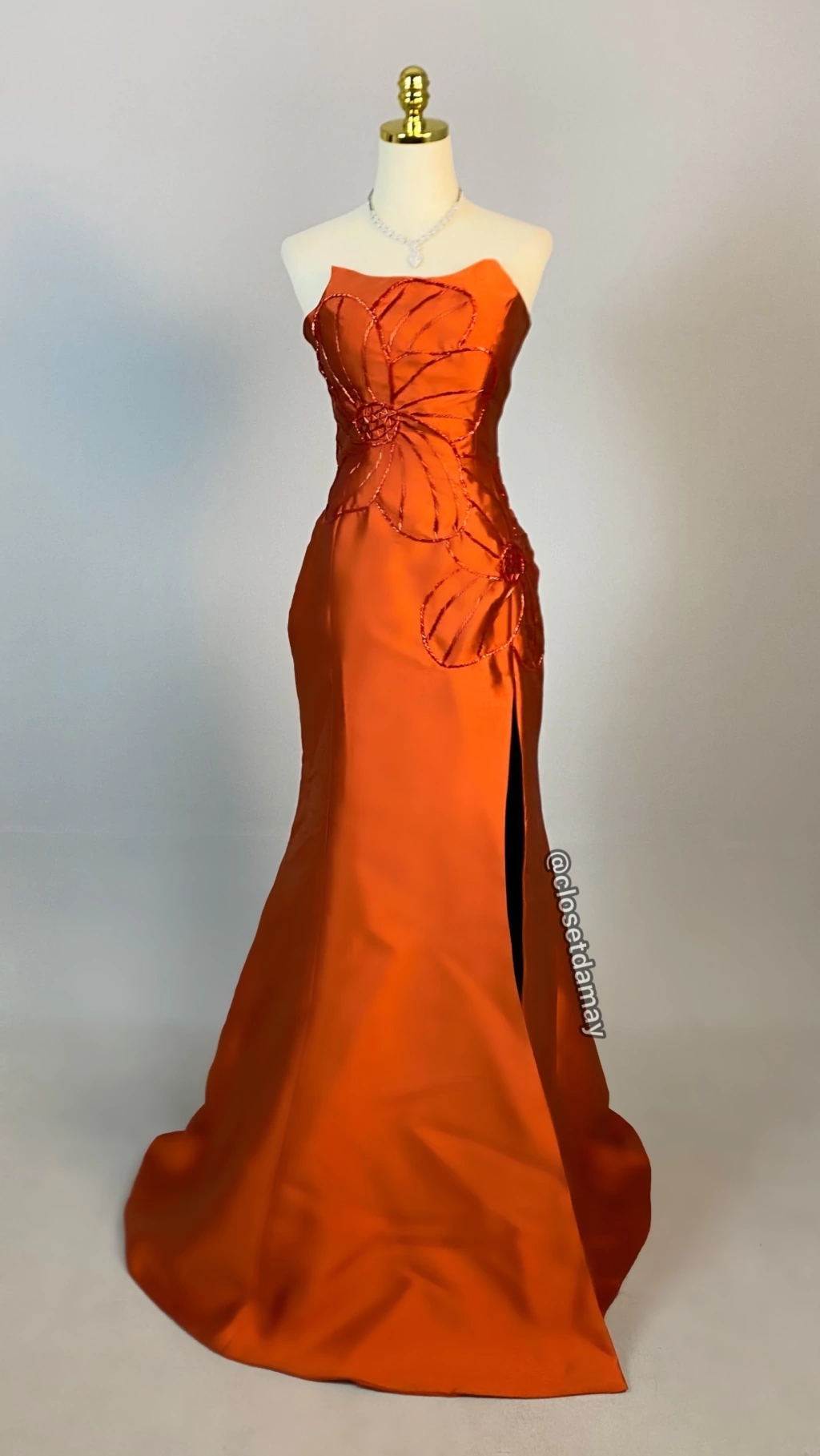 Vestido de festa longo, em zibeline, tomara que caia, com bordados, busto estruturado e fenda. Possui bojo, forro e zíper.
