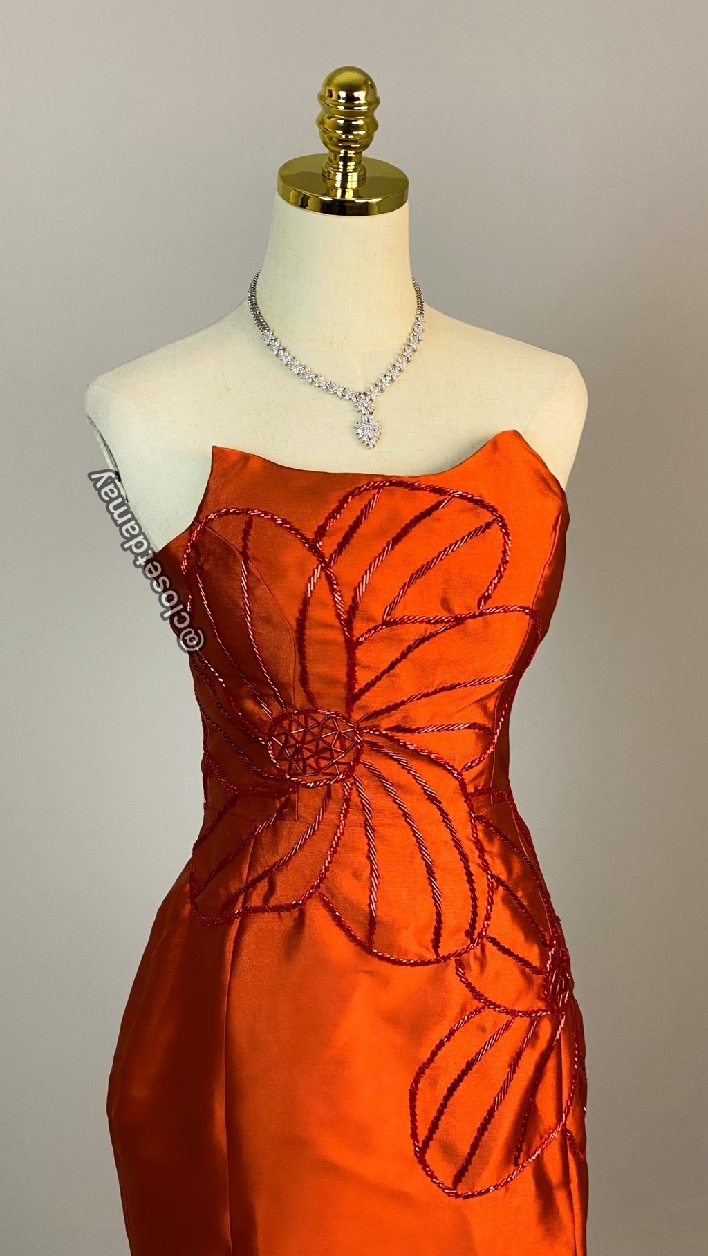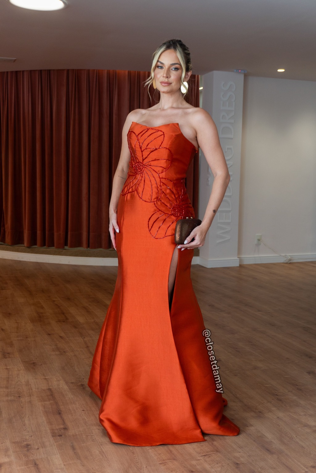 Vestido de festa longo, em zibeline, tomara que caia, com bordados, busto estruturado e fenda. Possui bojo, forro e zíper.