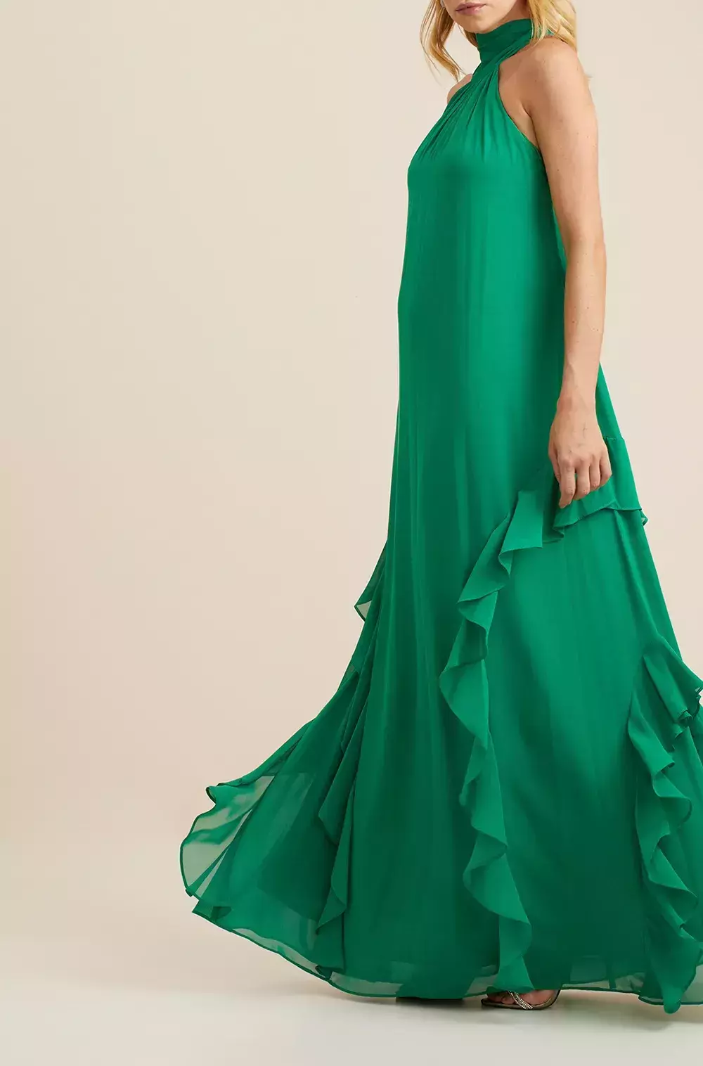 Vestido de festa longo, em chiffon, frente única, com babados na saia, leve drapeado no busto, proporcionando caimento e leveza à peça. Possui forro, bojo e zíper invisível.