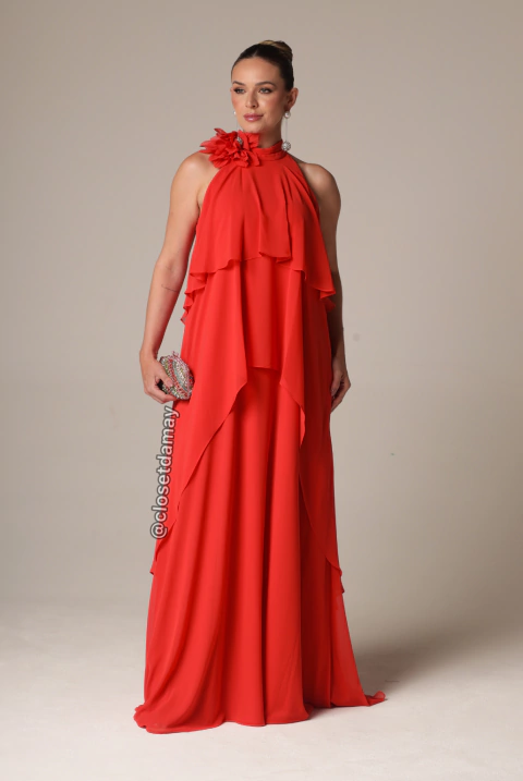 vestido de festa longo em chffon, frente única complementado por gola alta com franzido no pescoço, decote nas costas e babados assimétrico com caimento fluido e movimento encantador -