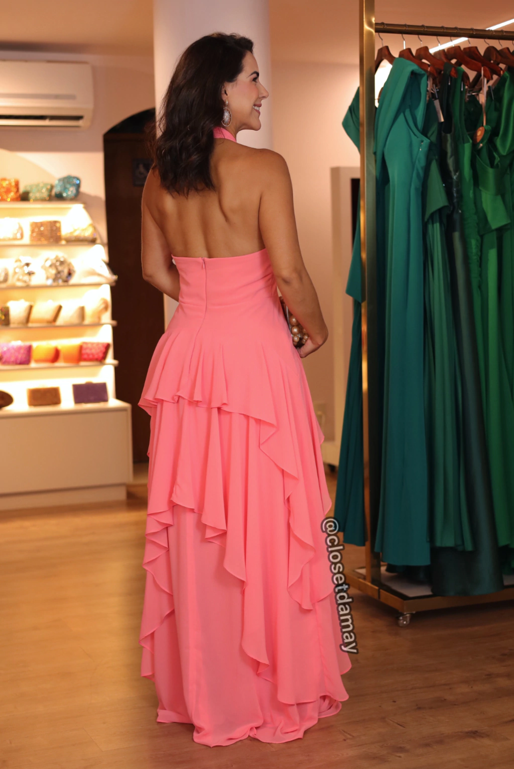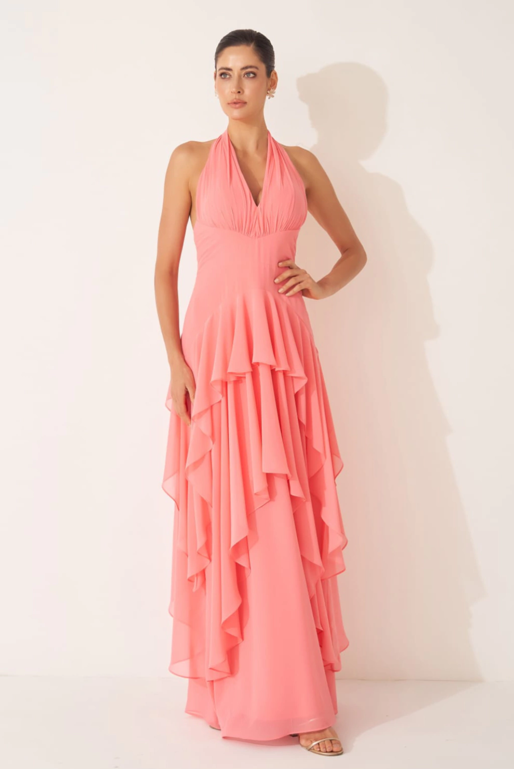 Vestido de festa longo em chiffon, frente única com decote em V e franzidos no busto e nas alças, acompanha camadas assimétricas em babados. Possui bojo, forro e zíper.
