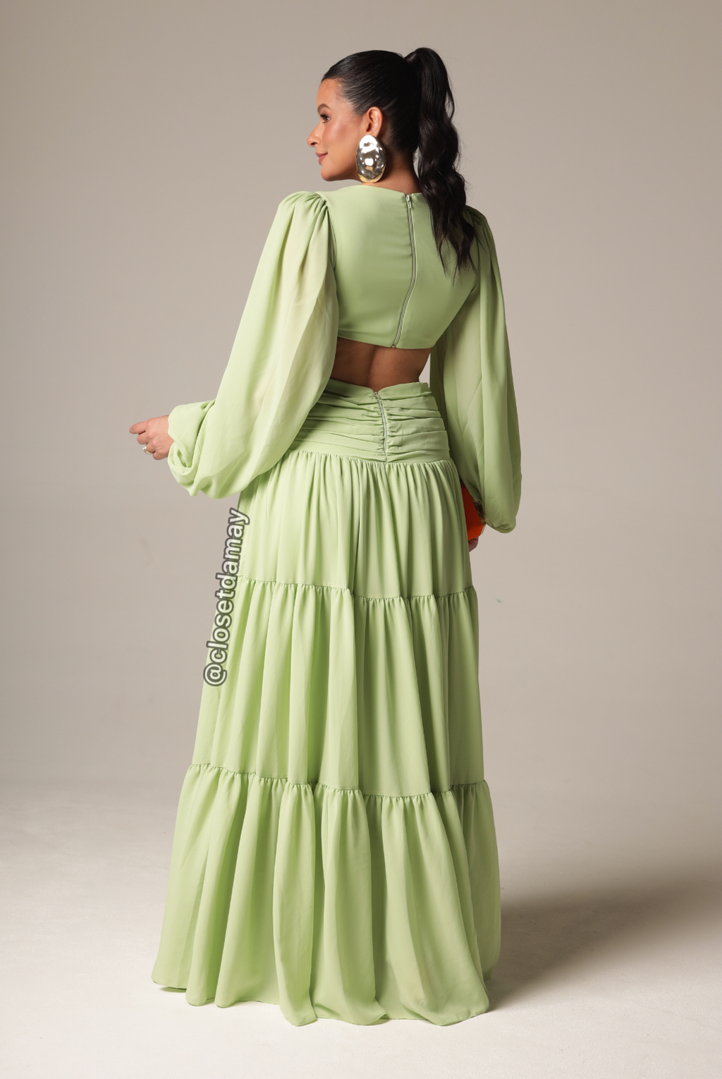 Vestido de festa longo em Chiffon. As mangas longas bufantes arremetem a um ar romântico e toque de poder e sofisticação. Os recortes na cintura transmitem uma mensagem de ousadia, sensualidade e estilo além de valorizar a silhueta com drapeado no busto e quadril que traz elegância à peça acompanhado de saia em camadas com movimentos fluidos. -