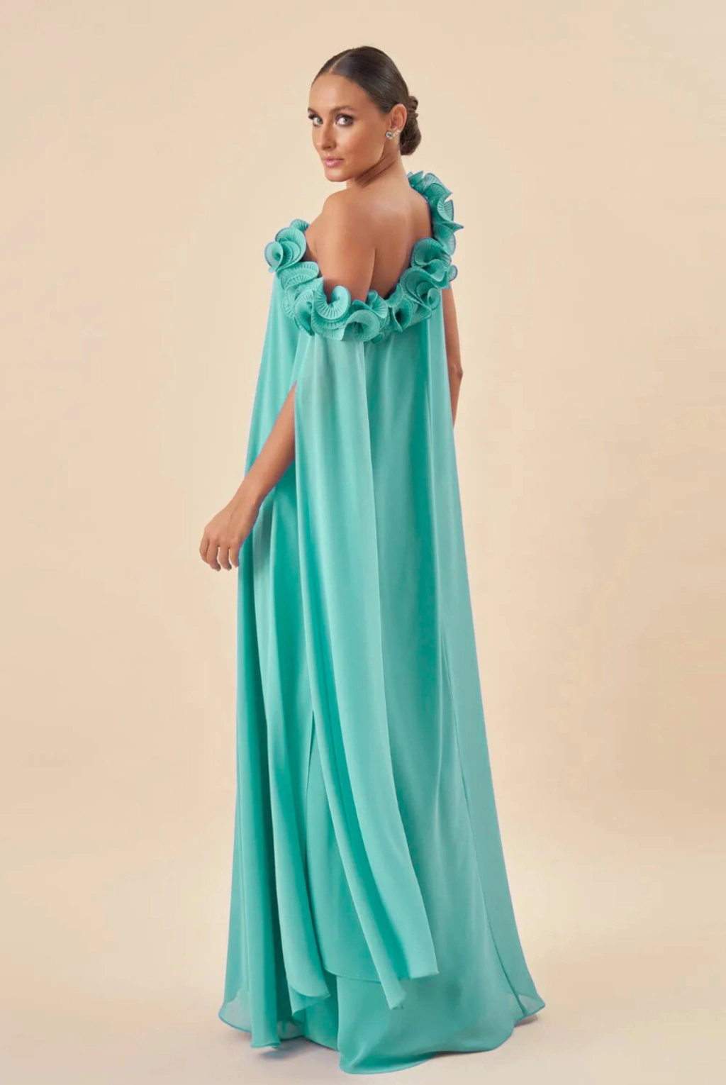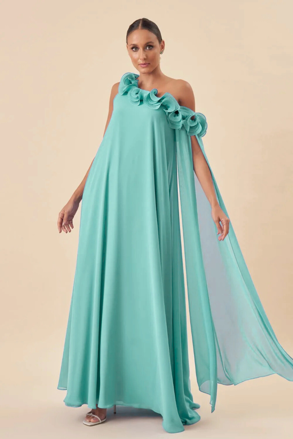 Vestido de festa longo, em chiffon, decote assimétrico, com detalhe de babado plissado, saia fluída. Possui bojo, forro e zíper.