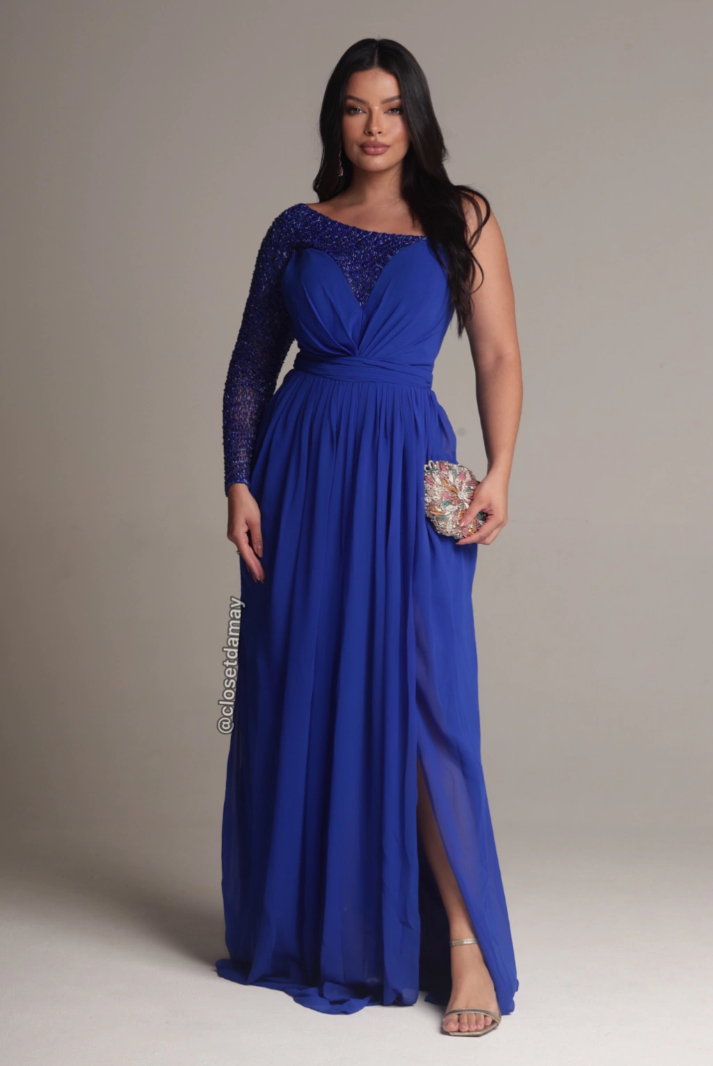 Vestido de festa longo, em musseline de seda, nula manga com bordados em pedraria. Possui bojo, forro e zíper.