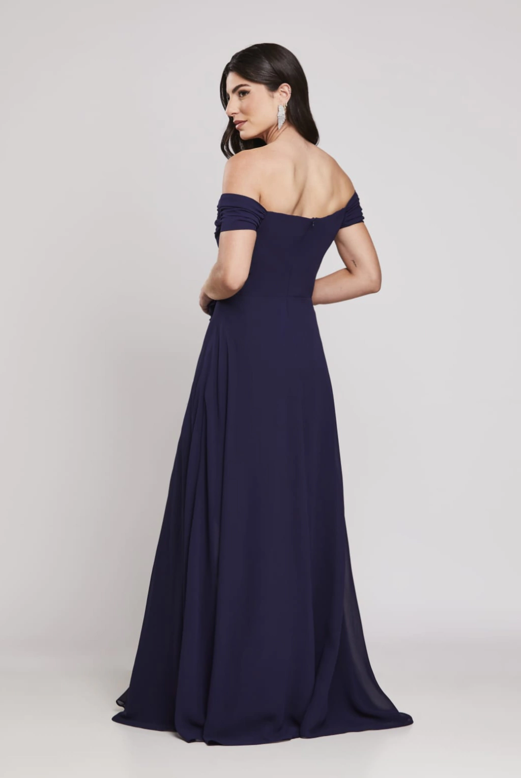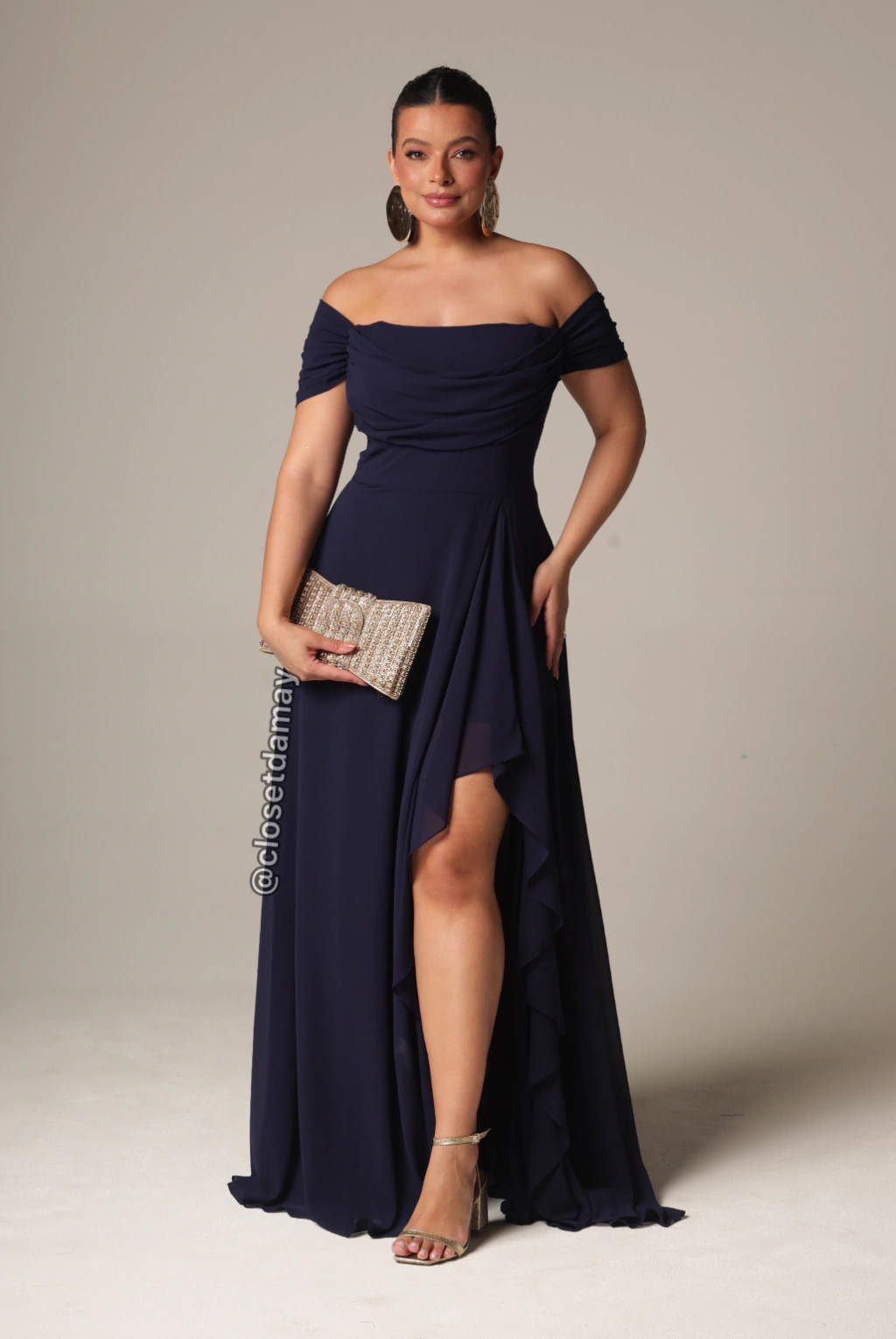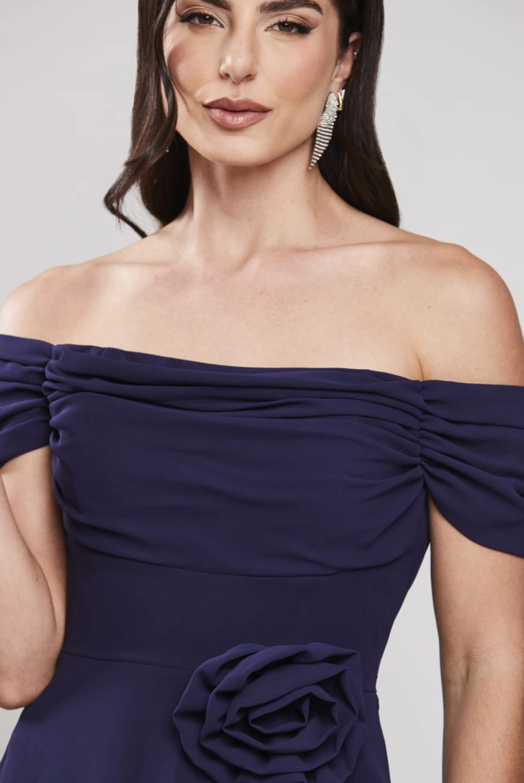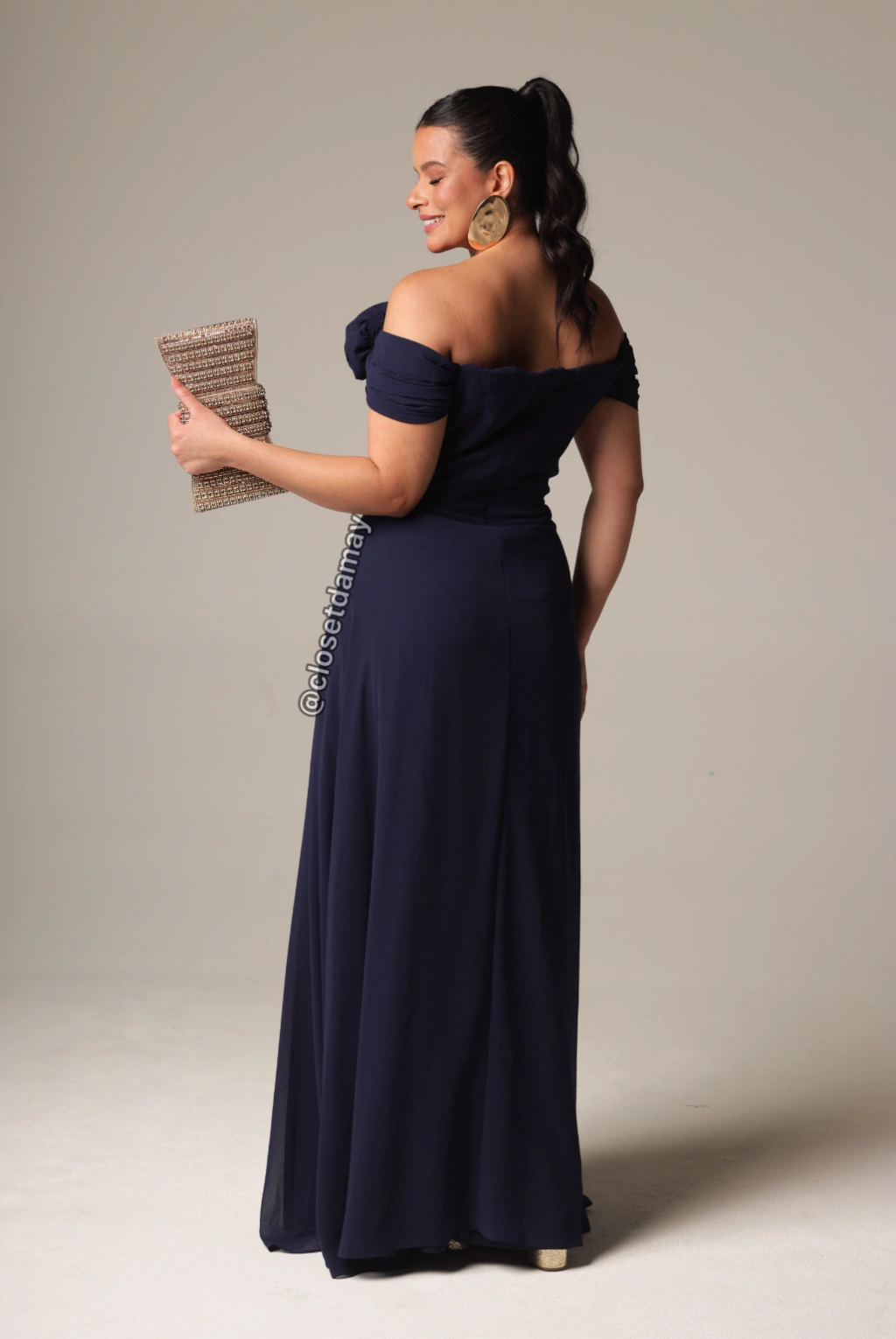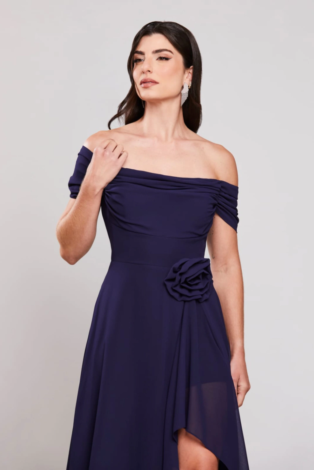 Vestido de festa longo, ombro a ombro, decote drapeado, detalhe de broche de flor, saia fluida com movimento por corte arredondado em tecido leve e fenda lateral.