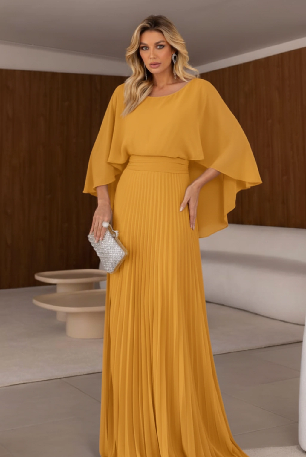 Vestido de festa longo em crepe de seda, plissado com capa fixa e faixa. Possui bojo forro e zíper invisível.