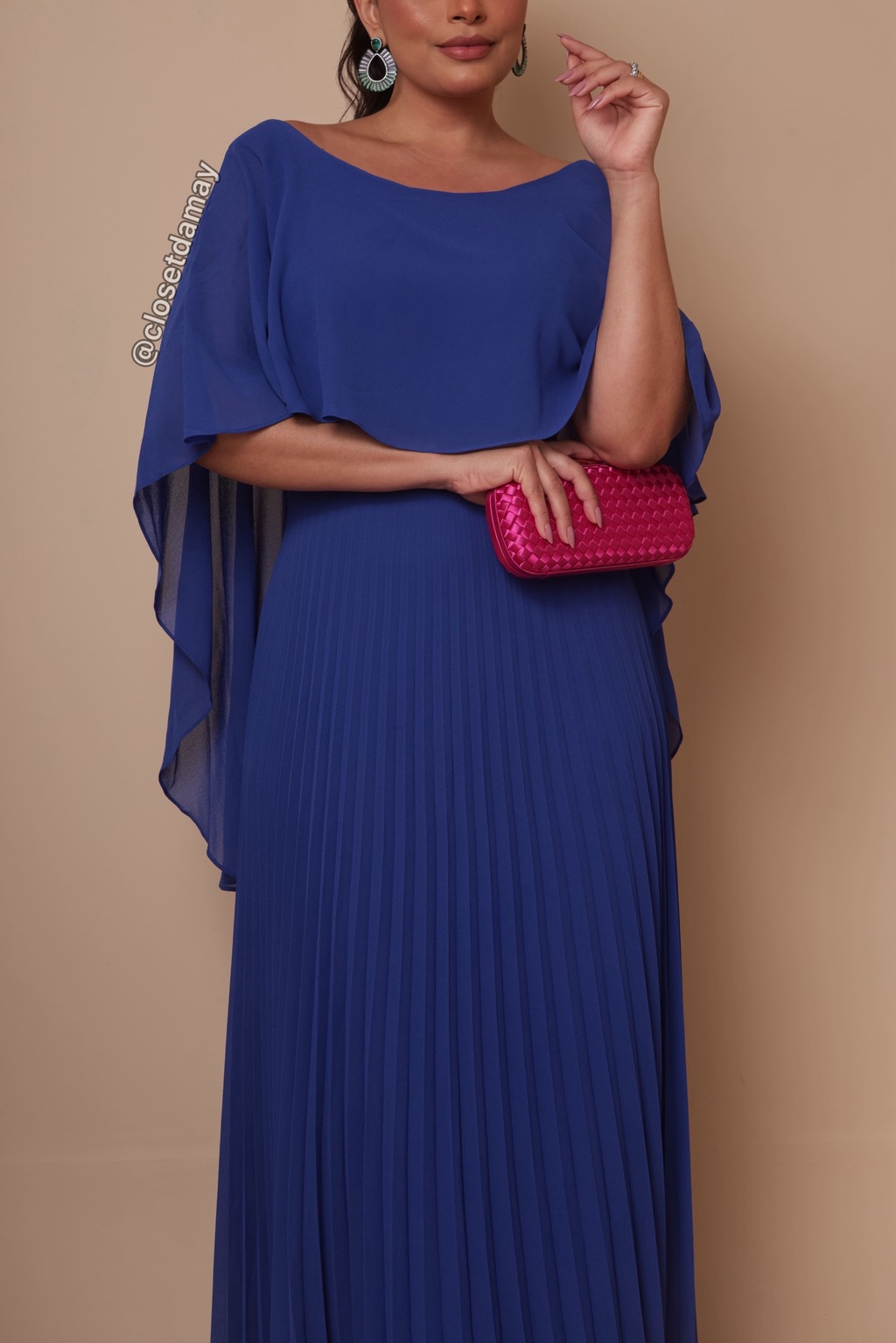 Vestido de festa longo em Chiffon, decote canoa, com capa fixa, saia evasê e cinto faixa removível. Possui bojo, forro e zíper
