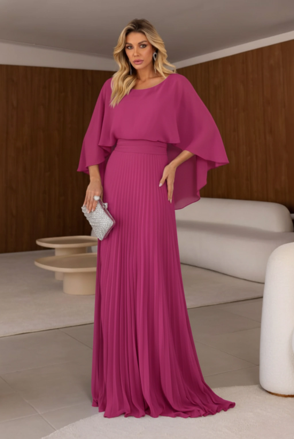 Vestido de festa longo em crepe de seda, plissado com capa fixa e faixa. Possui bojo forro e zíper invisível.