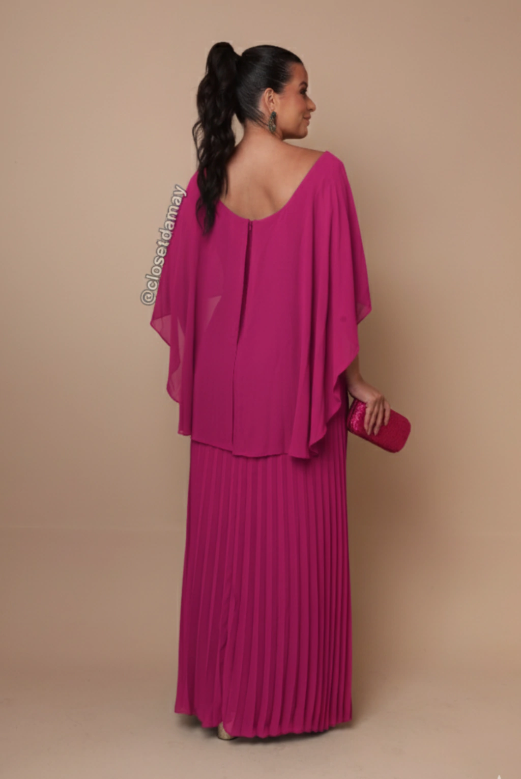 Vestido de festa longo em Chiffon, decote canoa, com capa fixa, saia evasê e cinto faixa removível. Possui bojo, forro e zíper
