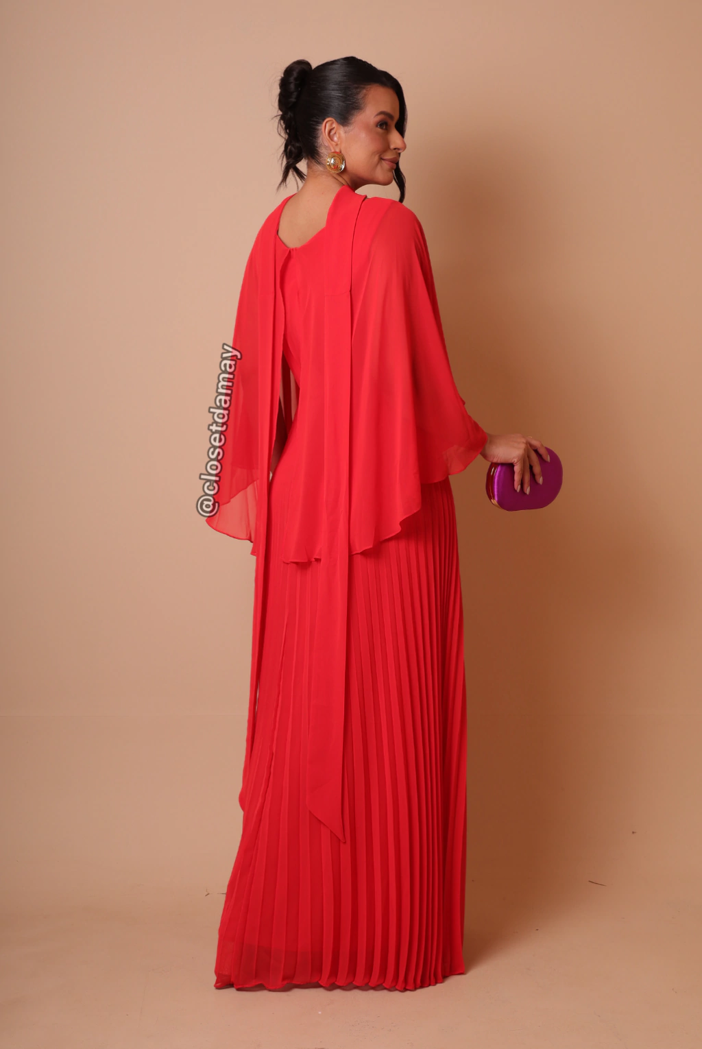 Vestido de festa longo em crepe de seda, plissado com capa fixa e faixa. Possui bojo forro e zíper invisível.