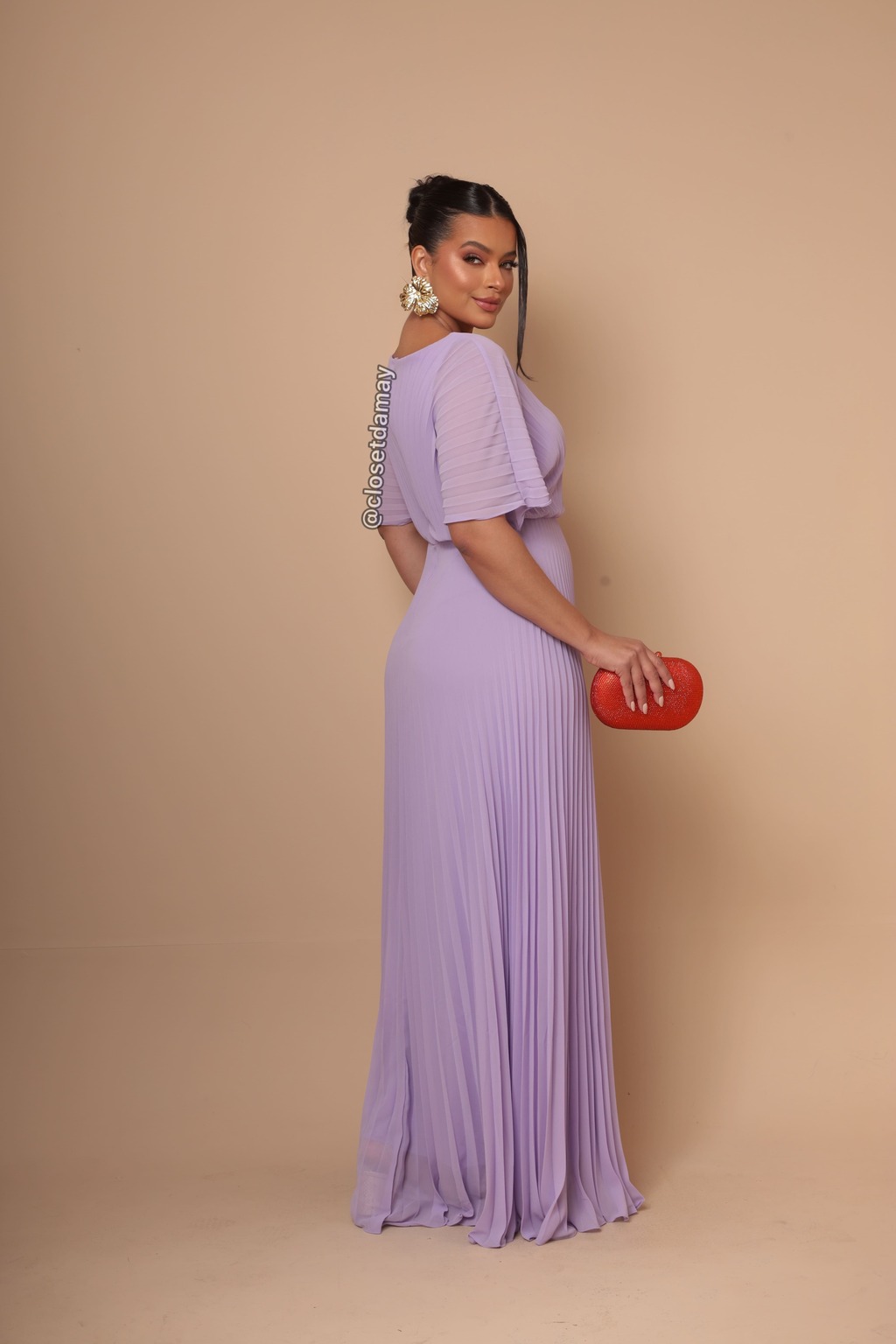 Vestido de festa longo, em crepe de seda, decote canoa, saia plissada e mangas 3\4. Possui forro, bojo e zíper invisível.
