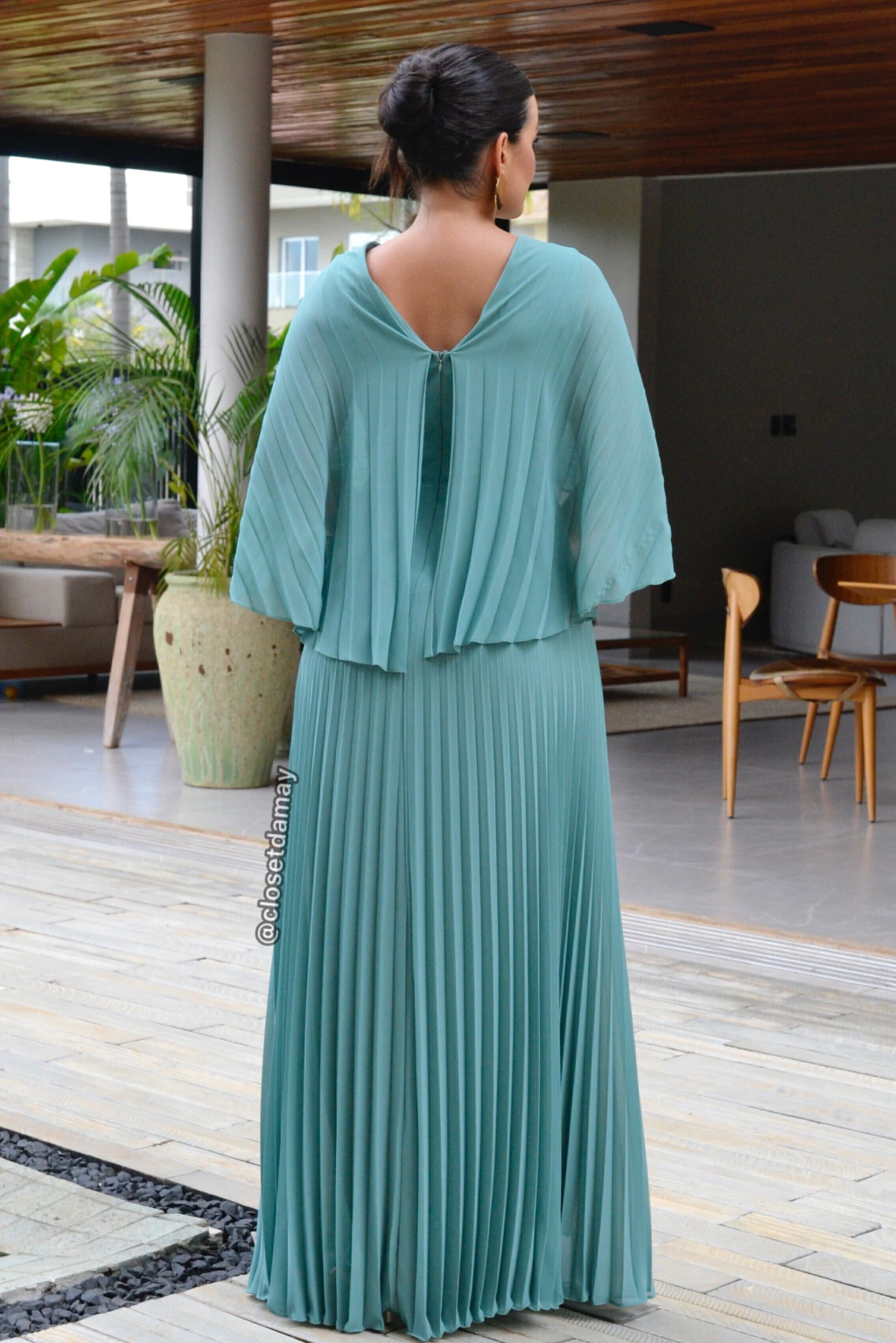 Vestido longo, em crepe de seda plissado com capa fixa, manga morcego, decote v e saia fluida. Possui bojo, forro e zíper.