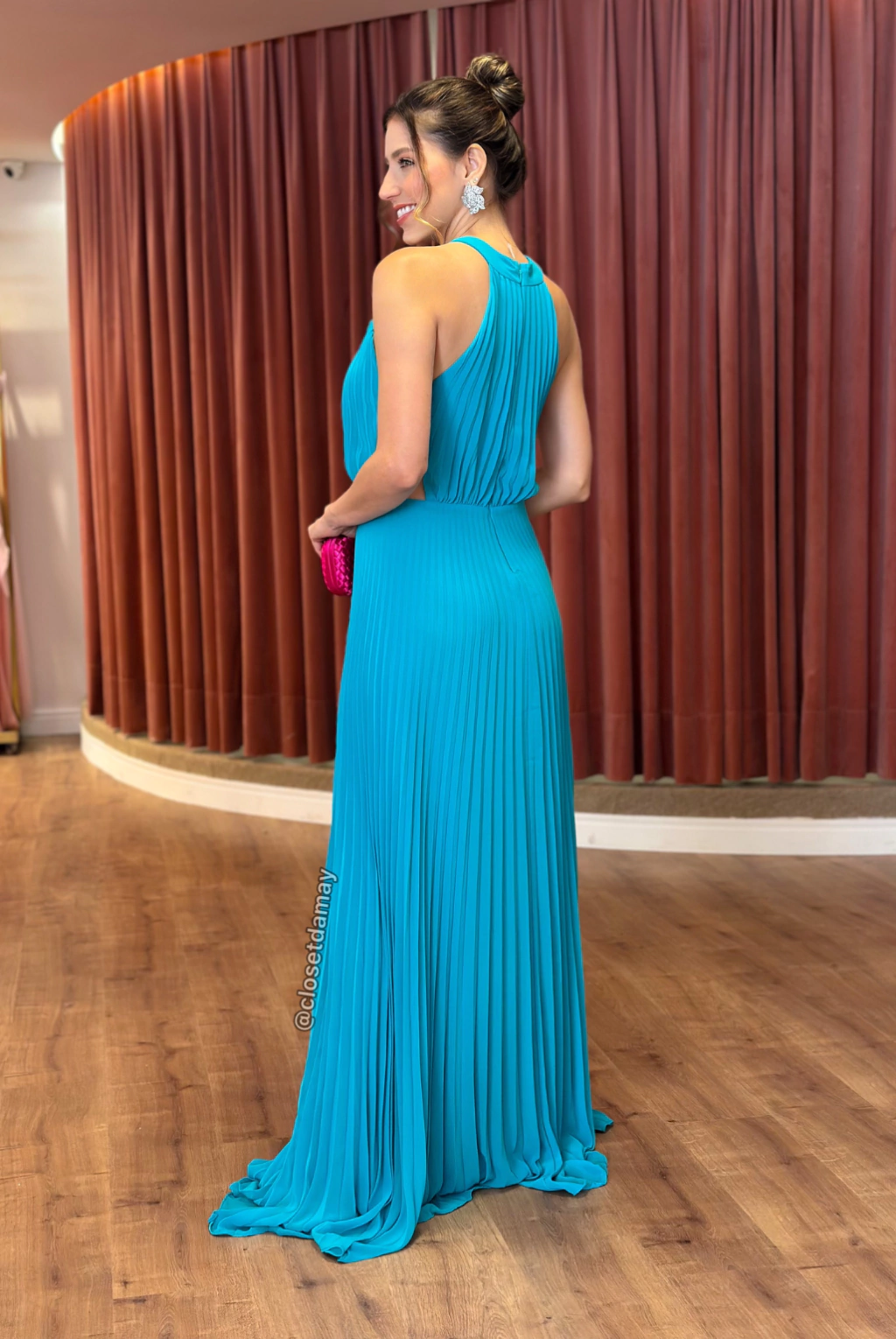 Vestido de festa longo plissado, com tule lateral e faixa - Azul Turquesa