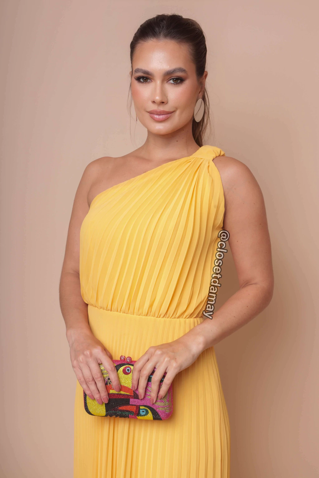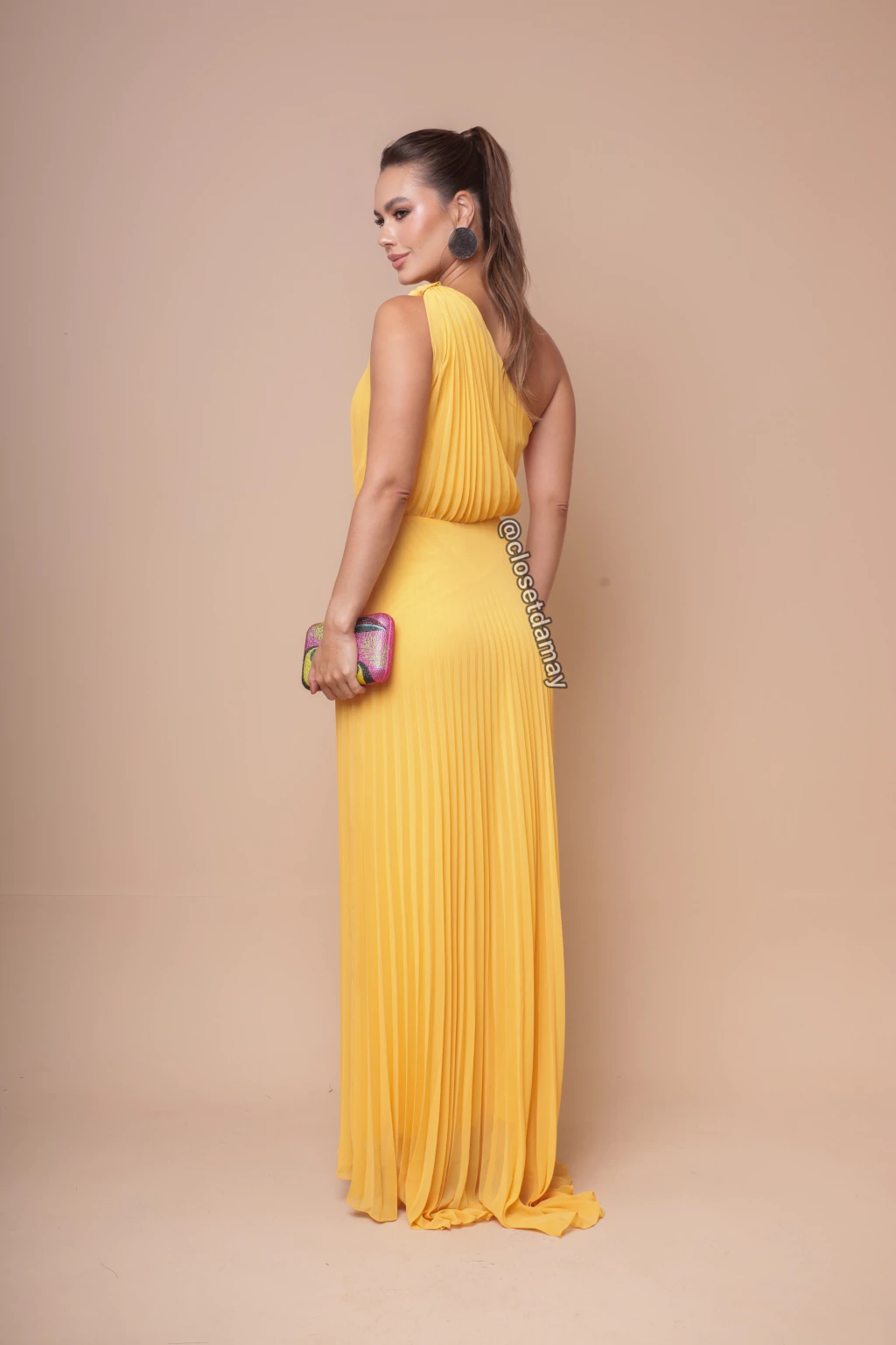 Vestido longo, decote assimétrico. Tecido em crepe de seda, proporcionando um caimento e leveza à peça, valorizando o corpo.