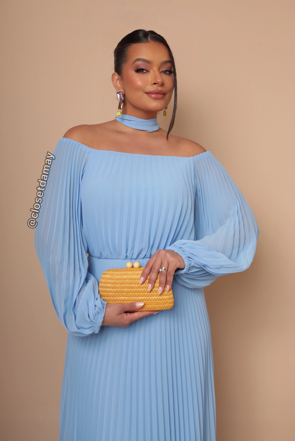 Vestido de festa longo, plissado, ombro a ombro, com mangas longas e ajustado com elástico nos pulsos e cintura.