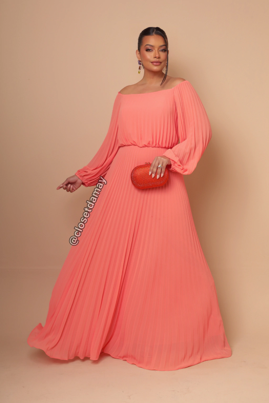 Vestido de festa longo, plissado, ombro a ombro, com mangas longas.