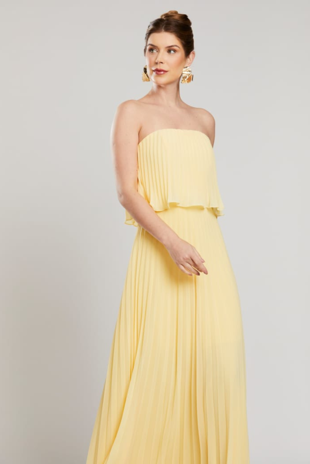Vestido de festa longo, plissado, tomara que caia e busto sobreposto em camada solta, criando movimento fluido e delicado enquanto a saia ampla e esvoaçante proporciona um caimento amplo e esvoaçante.