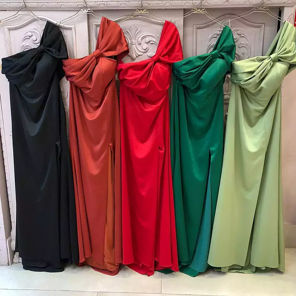 Vestido de festa longo plus size, ombro a ombro, detalhe de laço e fenda. Possui zíper, forro e bojo.