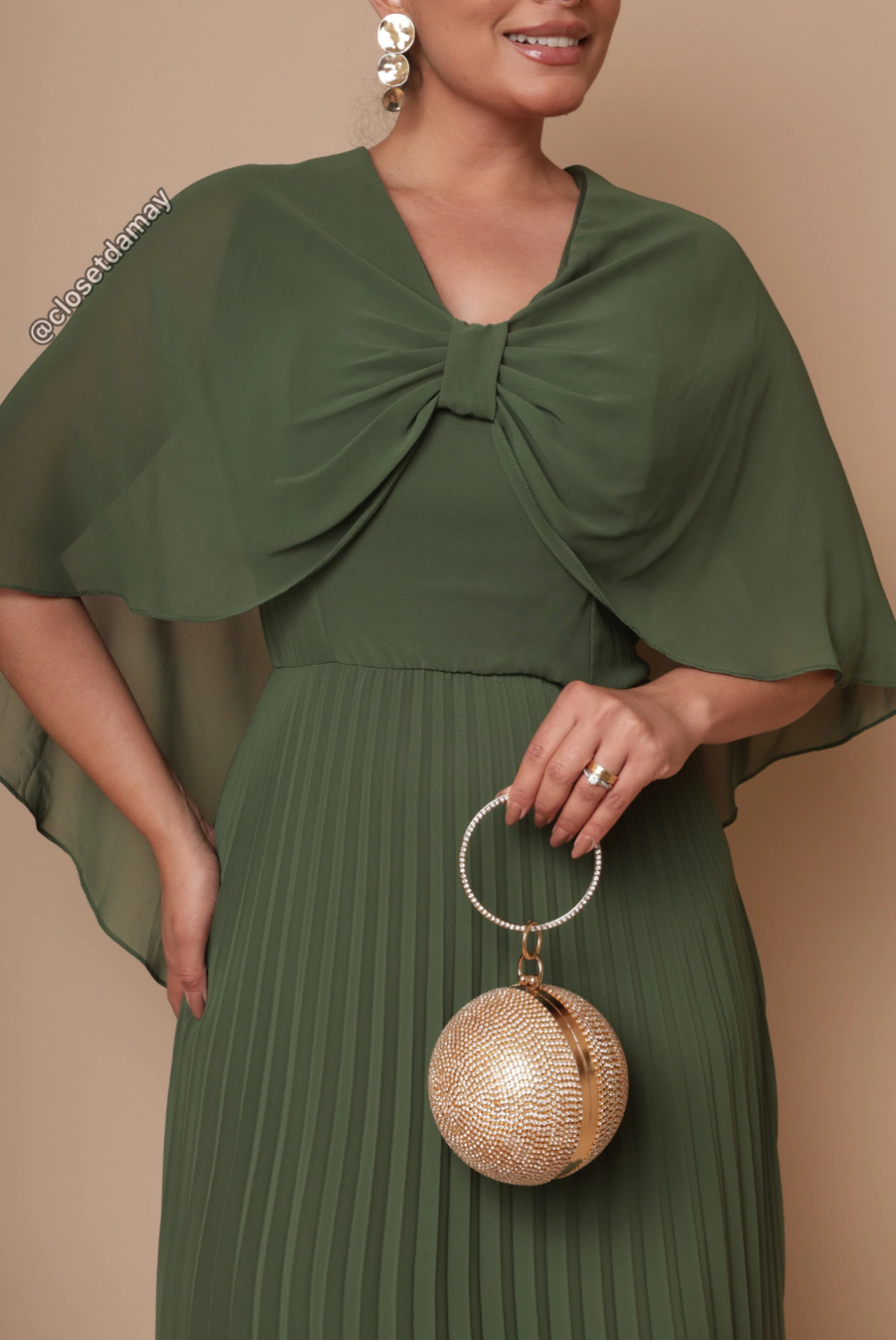 Vestido longo, tecido em crepe de seda plissado,com detalhe de nó fake, proporciona um caimento impecável, valorizando o corpo e trazendo leveza a peça.
