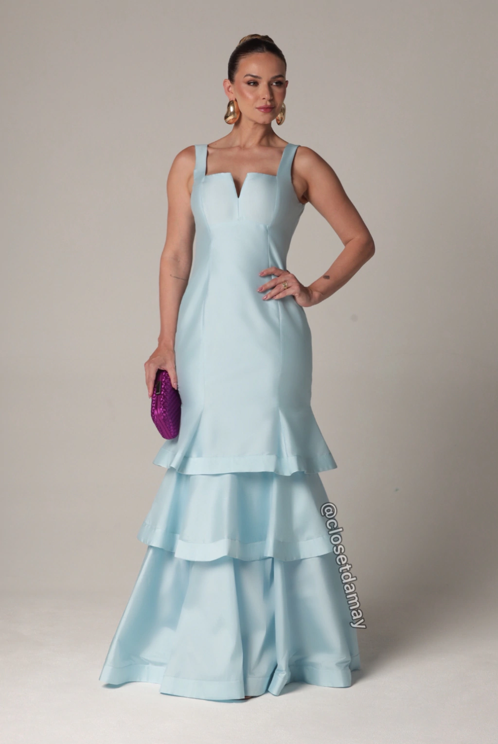 Vestido de festa longo, em tafetá com alça larga e decote estruturado reto com abertura, babados na saia . Possui bojo, forro e zíper.