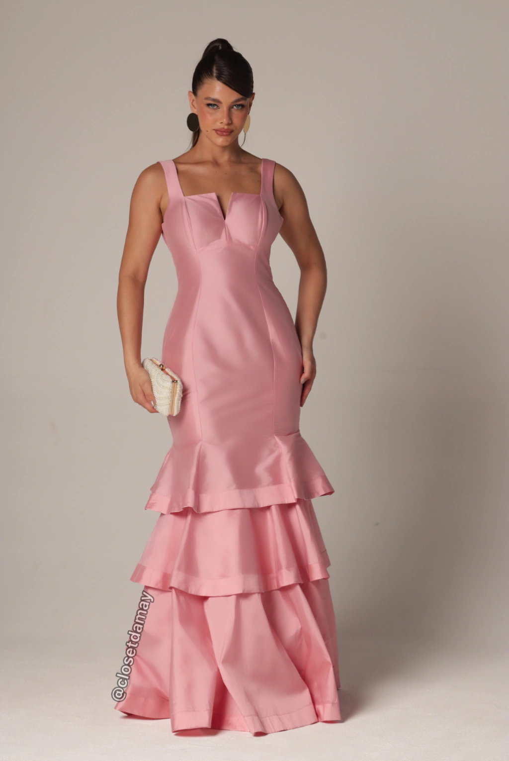Vestido de festa longo, em tafetá com alça larga e decote estruturado reto com abertura, babados na saia . Possui bojo, forro e zíper.