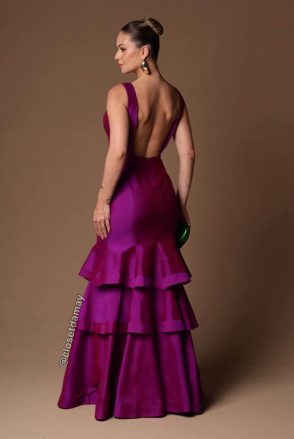 Vestido de festa longo, em tafetá com alça larga e decote estruturado reto com abertura, babados na saia . Possui bojo, forro e zíper.
