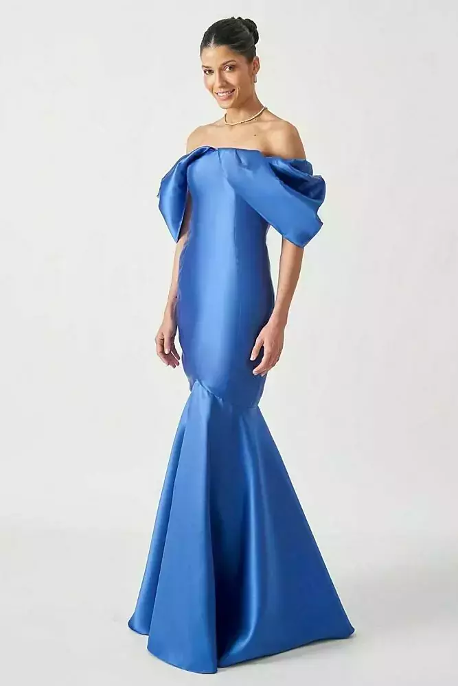 Vestido de festa longo sereia, em zibeline, ombro a ombro com mangas bufantes. Possui zíper.