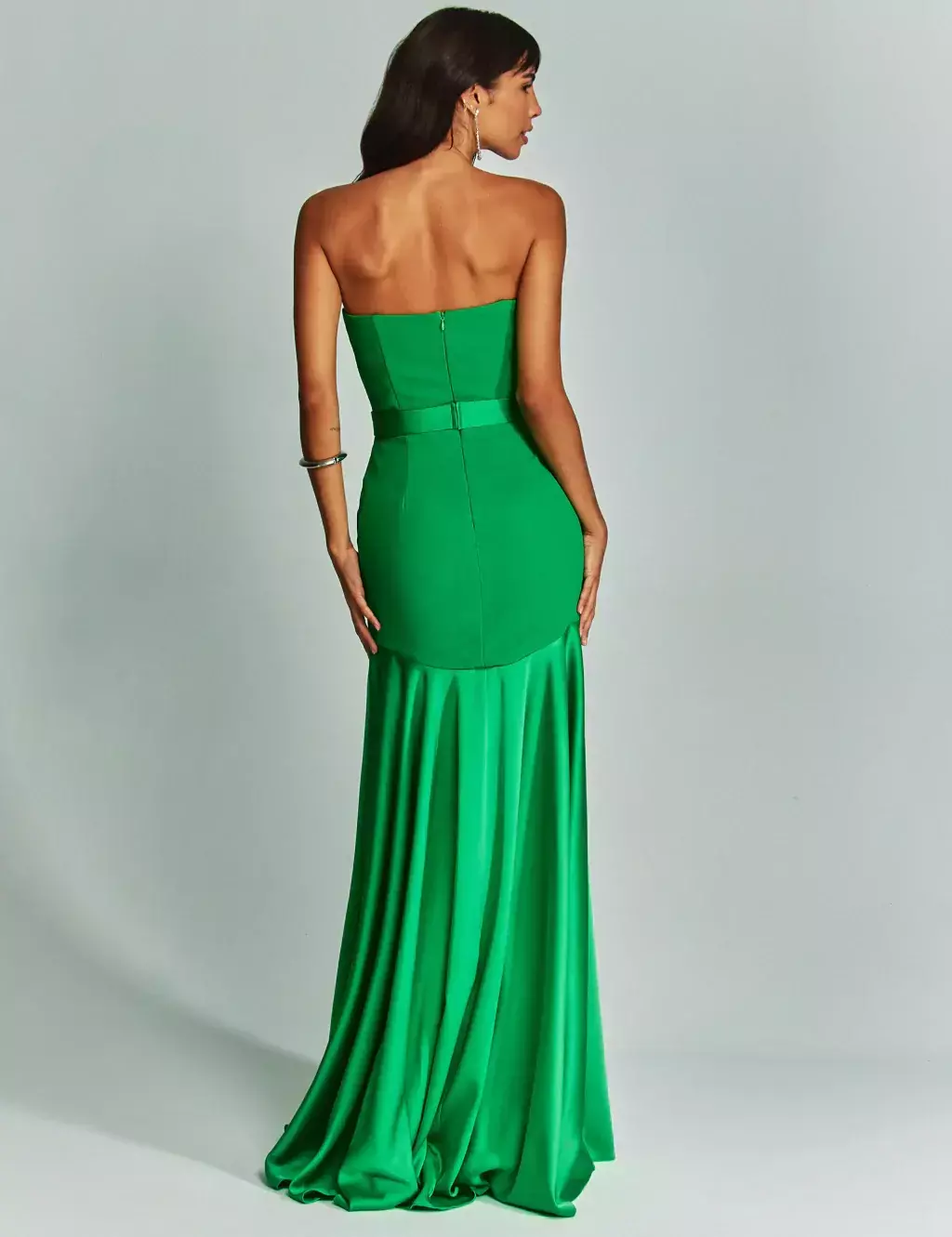 Vestido de festa longo sereia, tomara que caia, com decote profundo com tule e cinto removível. Possui bojo, forro e zíper.