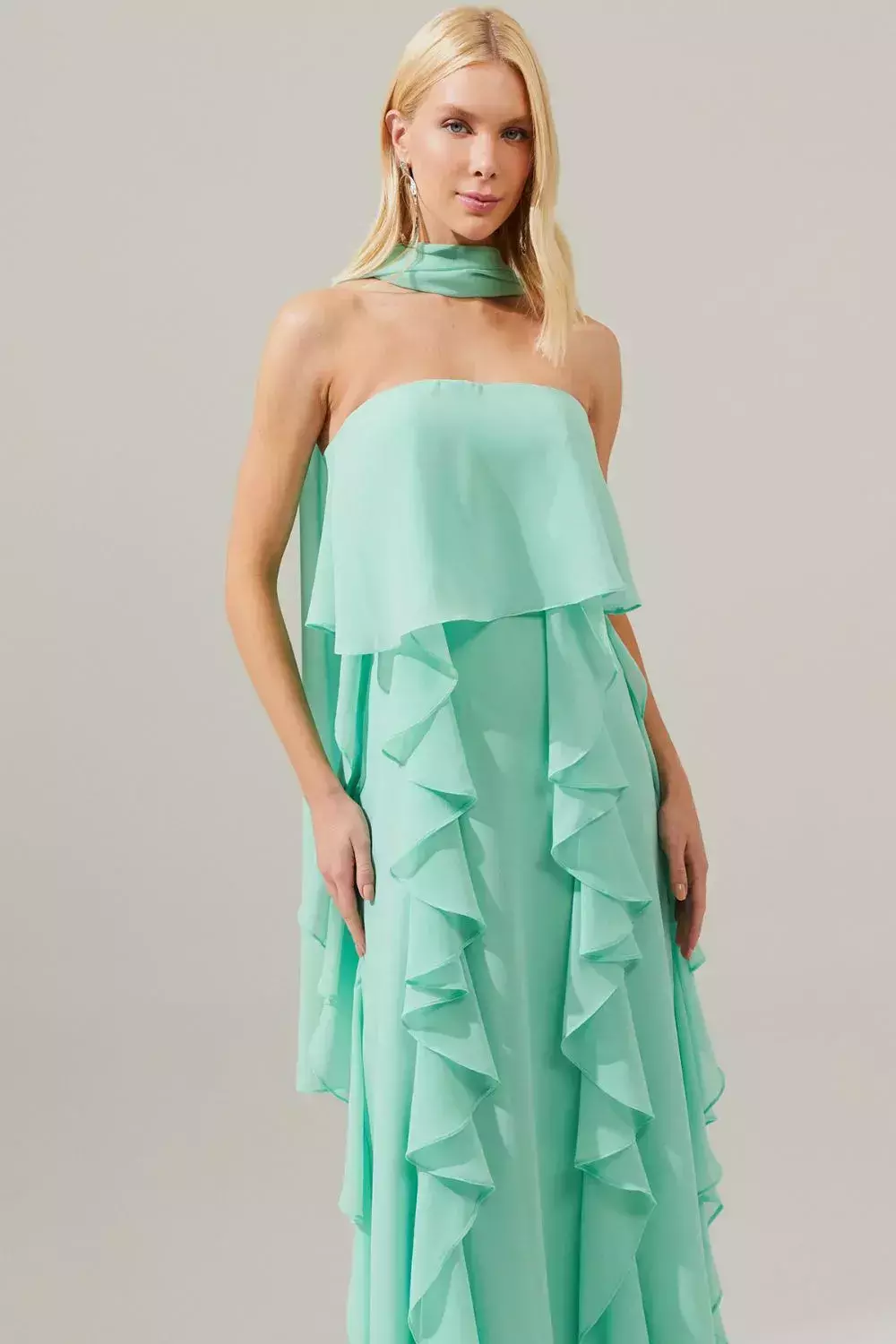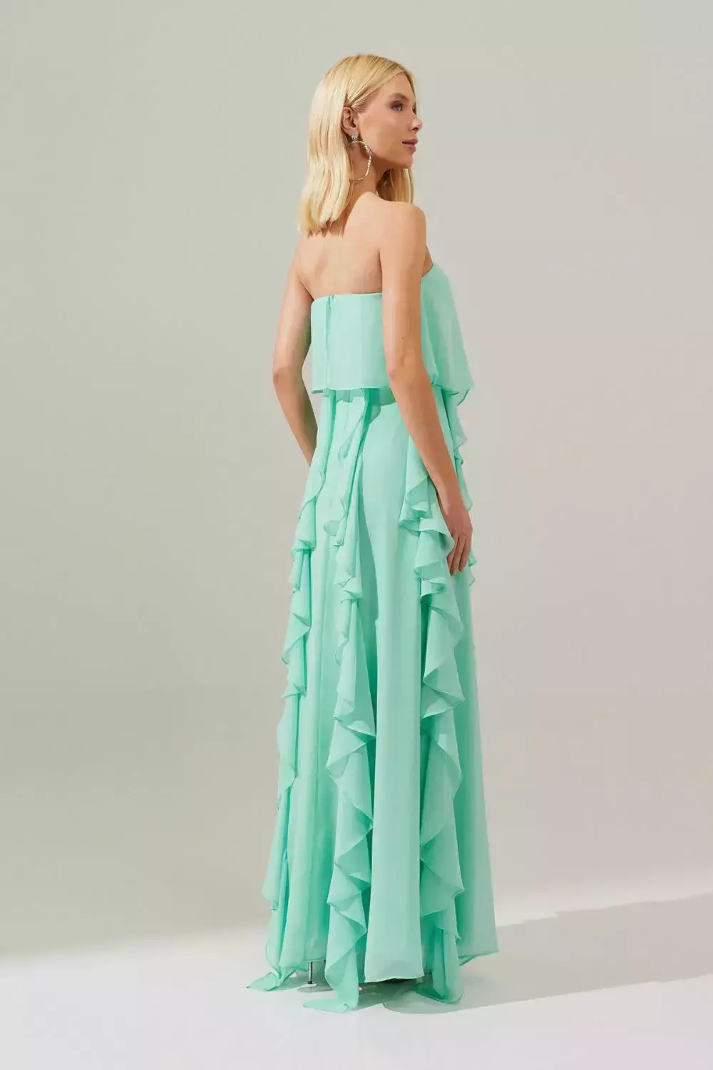 Vestido de festa longo, com decote reto sofisticado e realçado pelo bojo integrado e silicone interno, garantindo segurança e conforto durante todo o evento. A peça ganha destaque com os babados em camadas na saia, que criam volume e movimento dinâmico. A echarpe complementar adiciona versatilidade ao visual, permitindo diferentes formas de uso.