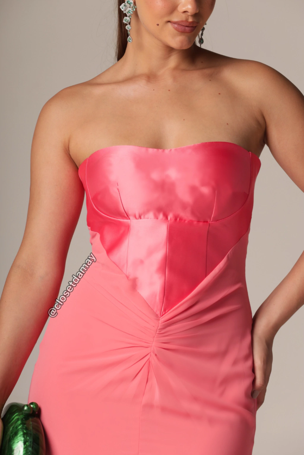 Vestido longo em zibeline e chiffon, que une estrutura e leveza em um só visual. O busto estruturado com recortes em zibeline valoriza o colo com decote sem alças elegante e moderno. O franzido no quadril em chiffon traz suavidade, equilibrando a imponência da saia sereia com fenda frontal. As costas apresentam fechamento com zíper invisível,