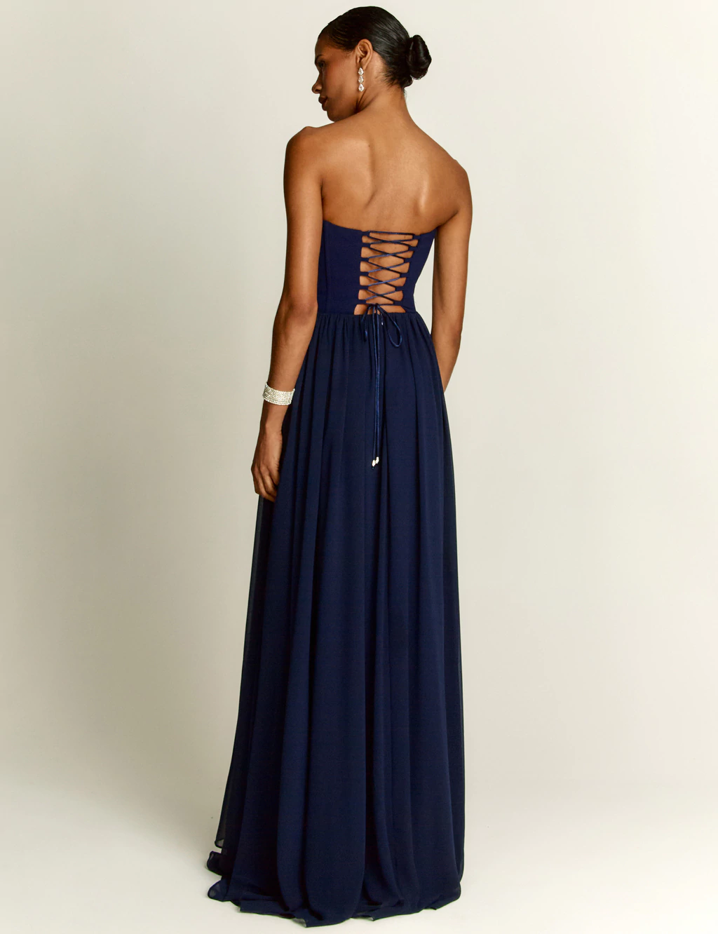 Vestido de festa longo. Este modelo tomara que caia exala sofisticação com seu corpete bem estruturado, valorizado por barbatanas que definem a cintura com perfeição. Nas costas, a combinação de regulagem estilo corset e zíper invisível garante ajuste impecável ao corpo. A saia ampla e leve proporciona movimento e fluidez ao look, ideal para ocasiões especiais. Como toque final, acompanha um lenço para o pescoço, que adiciona charme e elegância à produção.