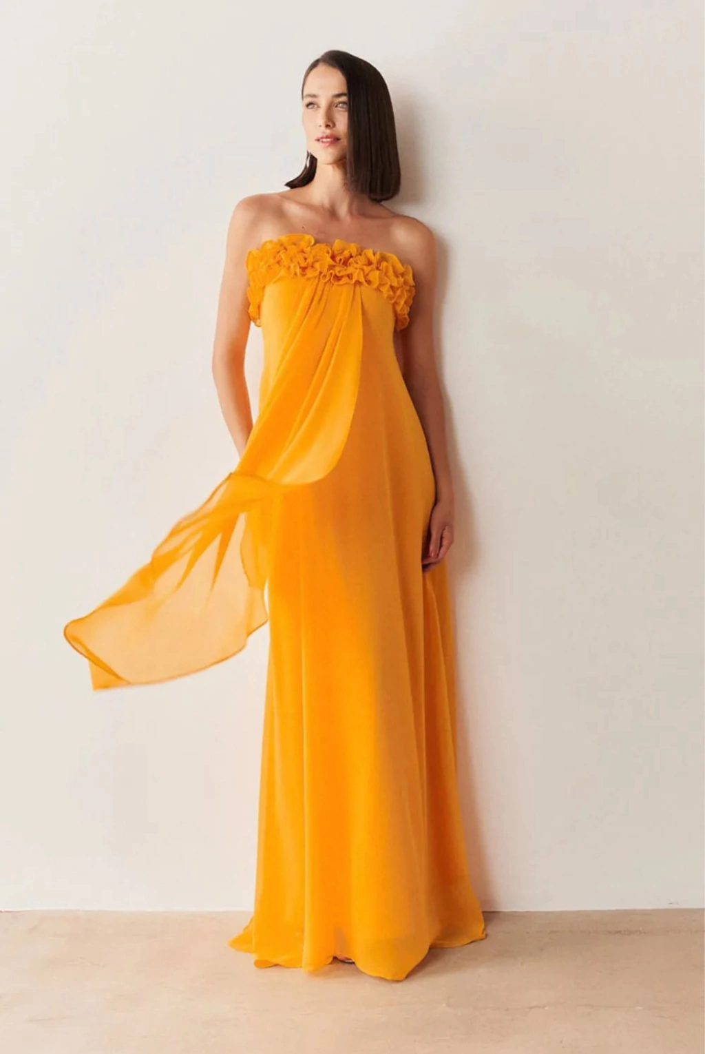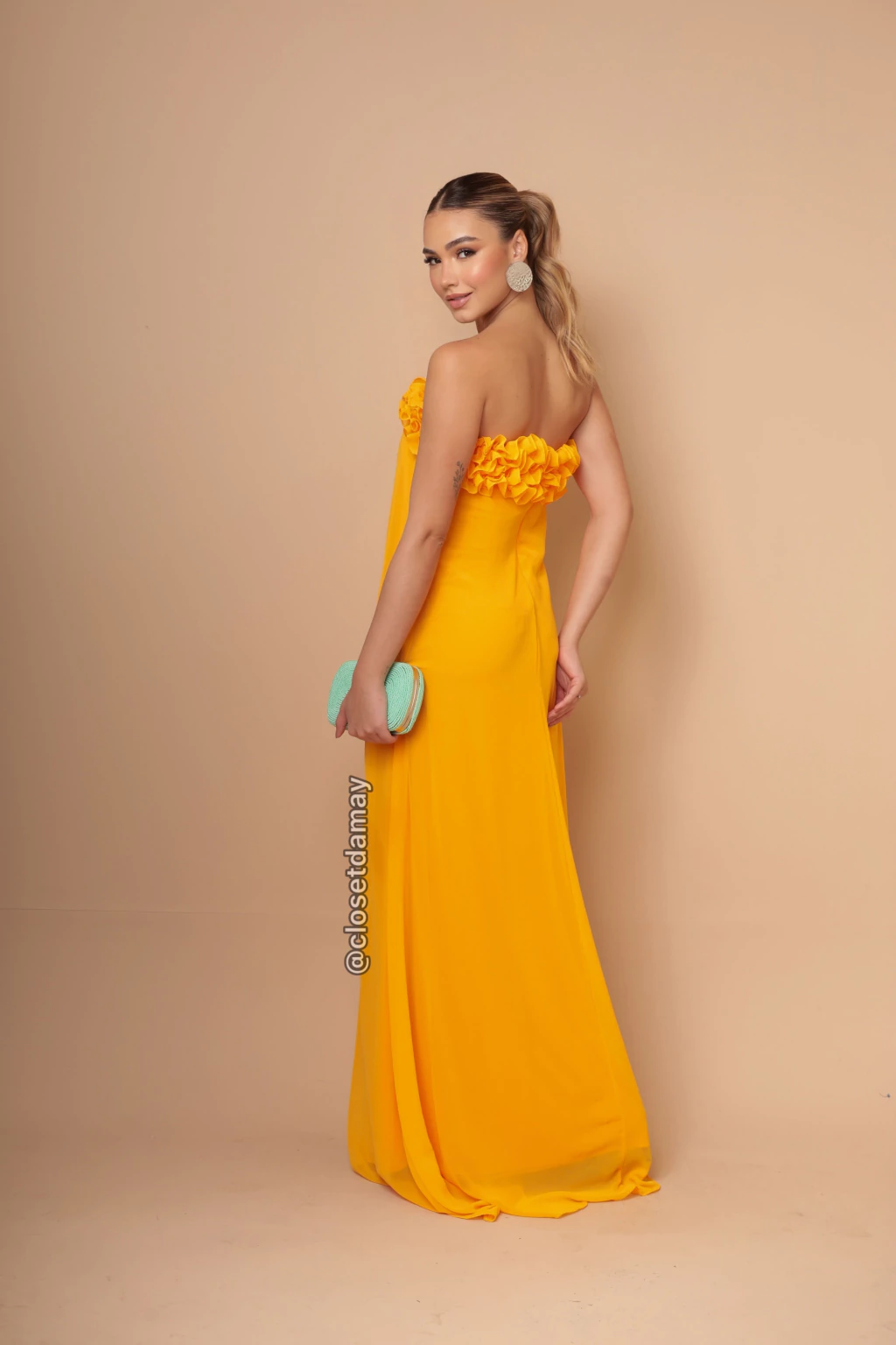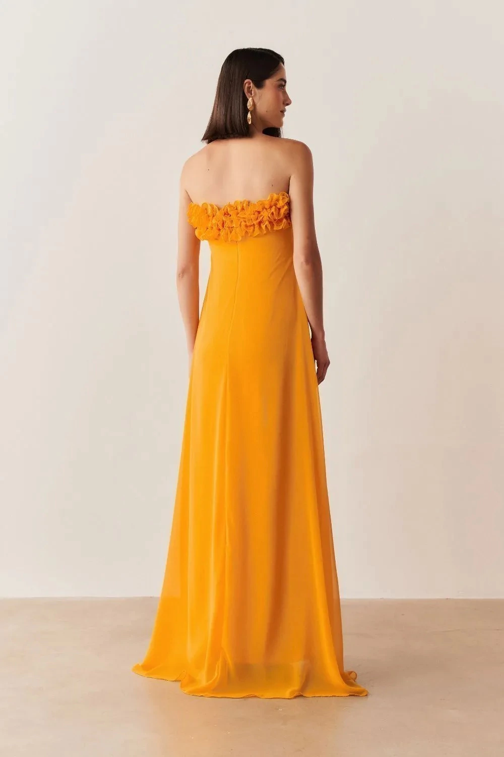 Vestido Longo, sem alça, em chiffon, com babados no decote e calda frontal que acrescenta um toque de sofisticação à peça.