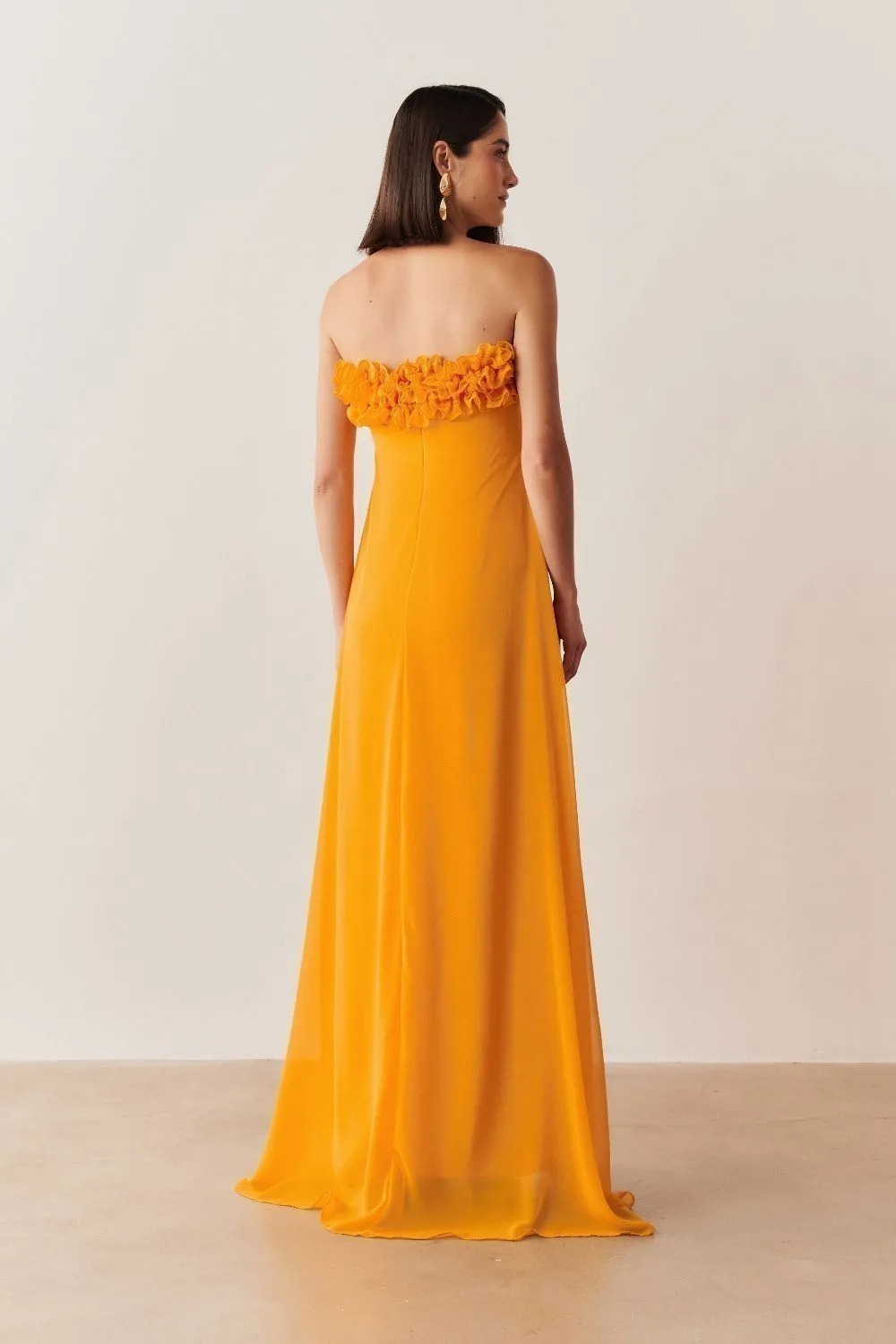 Vestido Longo, sem alça, em chiffon, com babados no decote e calda frontal que acrescenta um toque de sofisticação à peça.