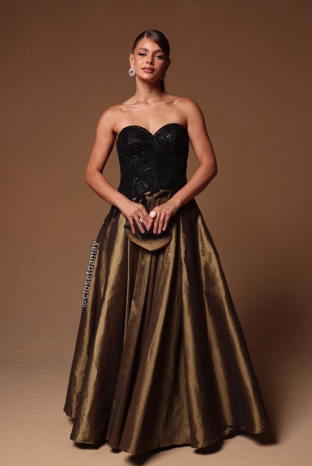 Vestido de festa longo, em tafetá, com busto bordado, tomara que caia com laço. Possui bojo, forro e zíper.