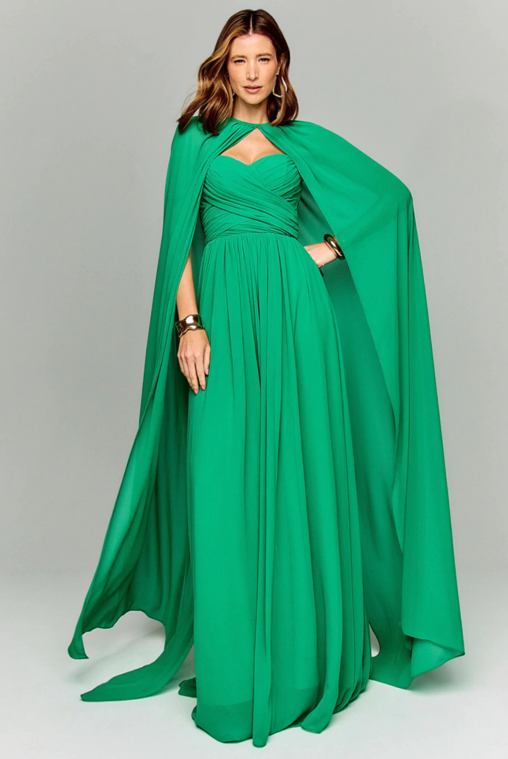 Vestido de festa longo, tomara que caia decote coração, busto drapeado,capa removível e saia fluída. Verde Bandeira