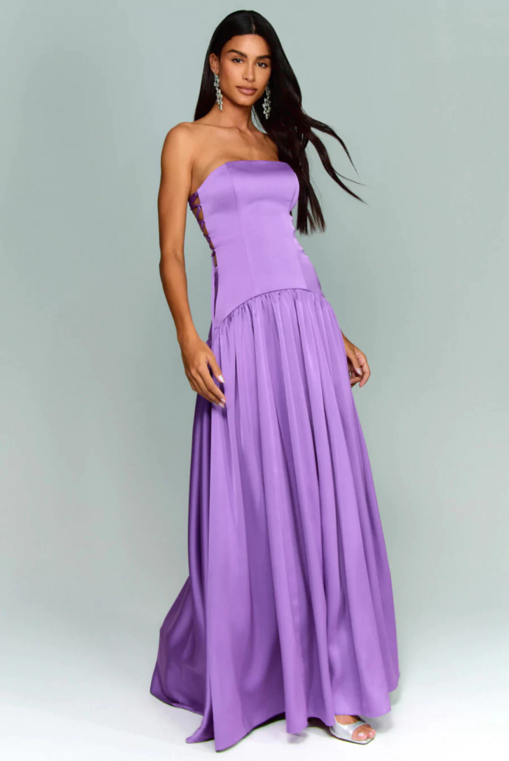 Vestido de festa longo, tomara que caia com decote reto, corpete estruturado e regulagem estilo corset nas laterais. A cintura drop waist alonga a silhueta, enquanto a saia ampla traz o charme do estilo princesa. Possui bojo interno e zíper invisível nas costas.