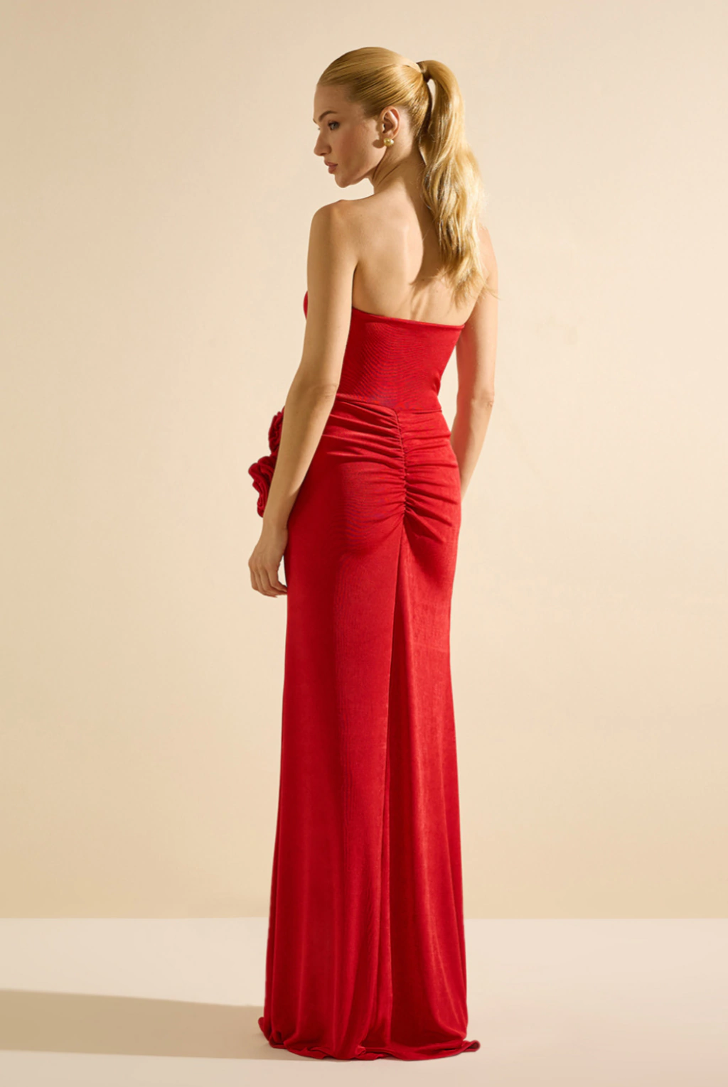 Vestido de festa longo em crepe encorpado, tomara que caia com decote reto. O drapeado lateral destaca duas flores aplicadas na altura da cintura, conferindo sofisticação e feminilidade à peça. A fenda frontal proporciona charme e leve sensualidade ao visual. Parte posterior com modelagem justa e drapeado central que valoriza a silhueta.