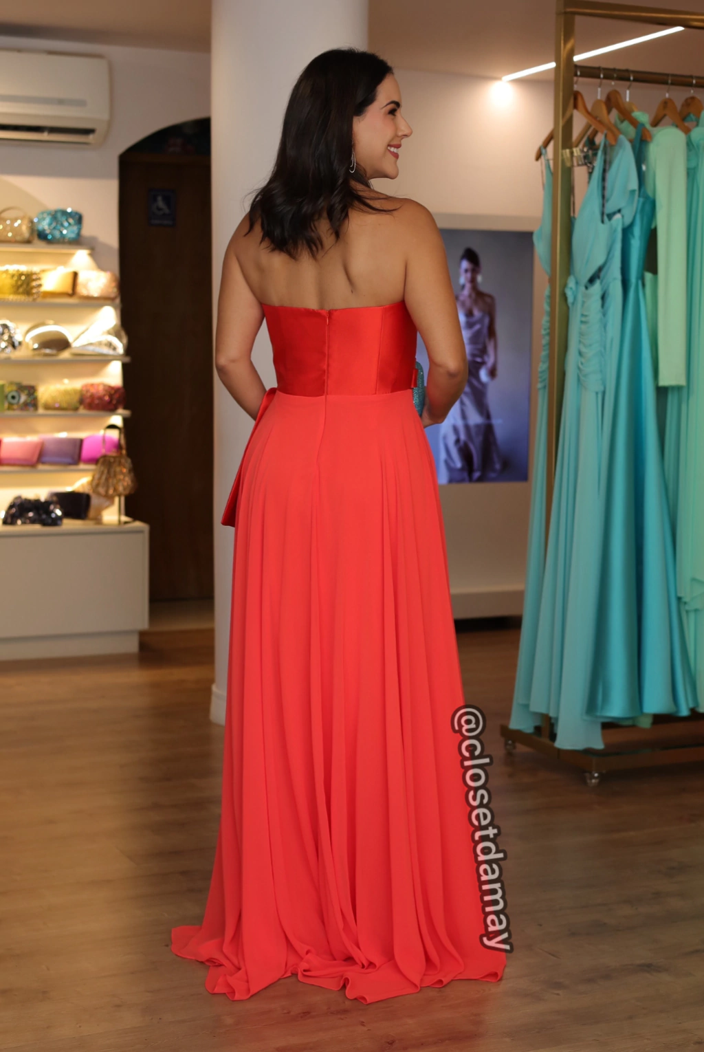 Vestido de festa longo em zibeline com chiffon, tomara que caia com decote assimétrico drapeado no busto, detalhe de faixa que cai em cascata na cintura em zibeline, saia fluida em chiffon. Possui bojo, forro e zíper.