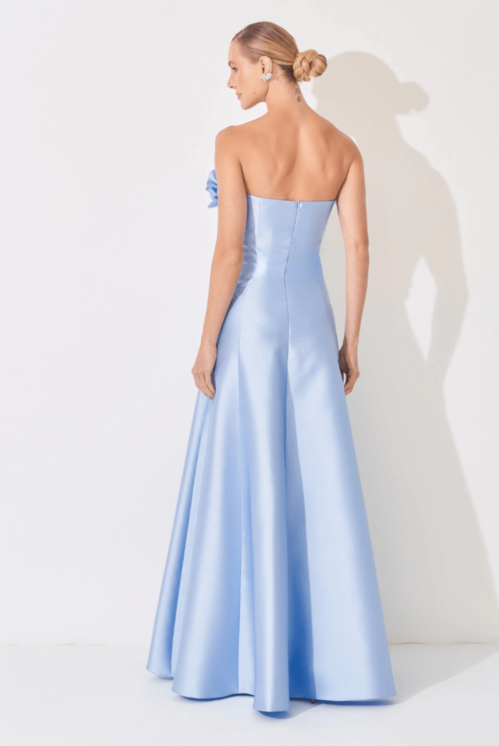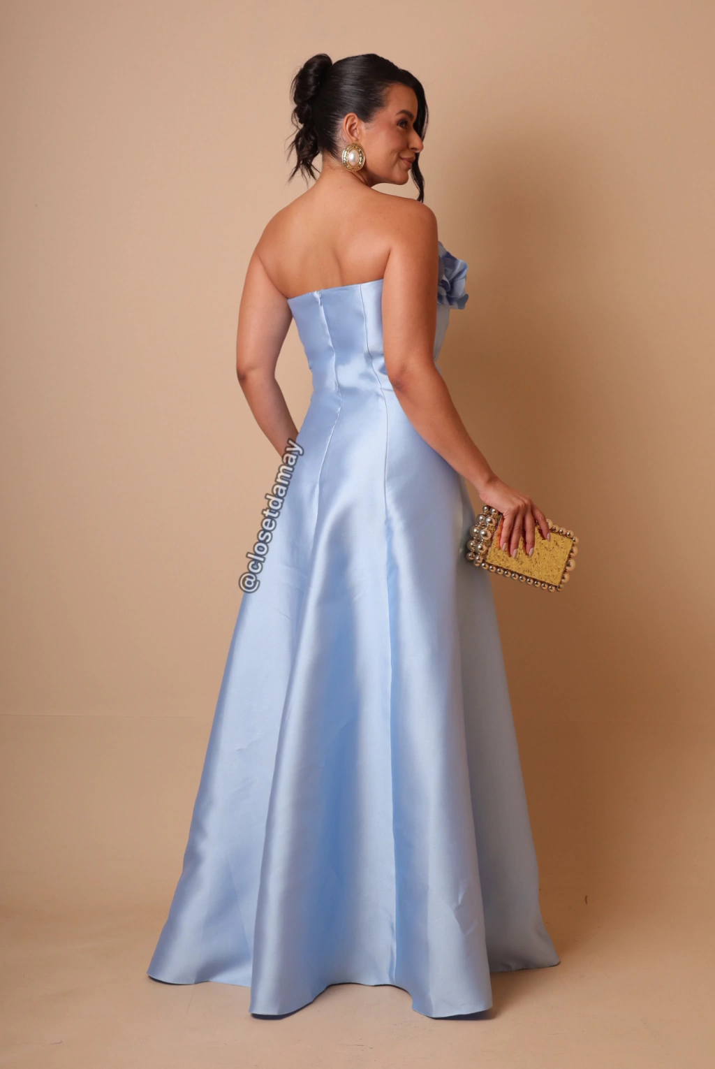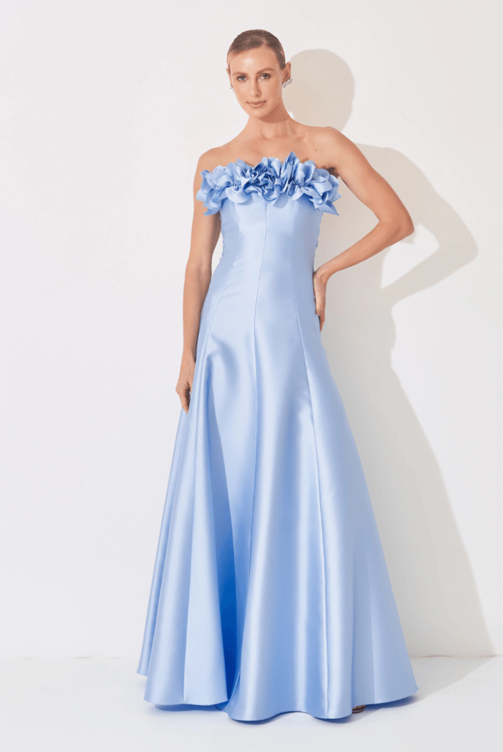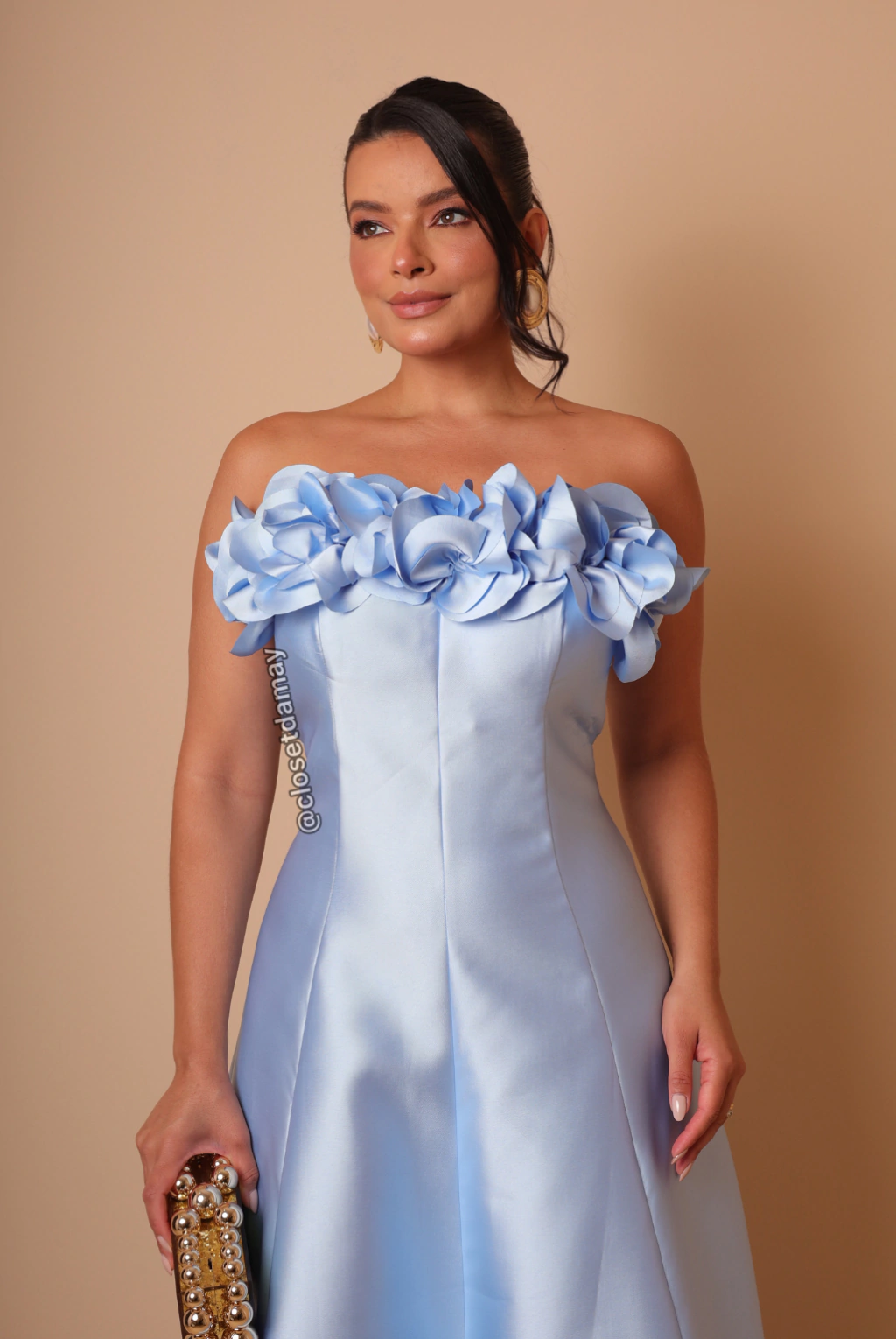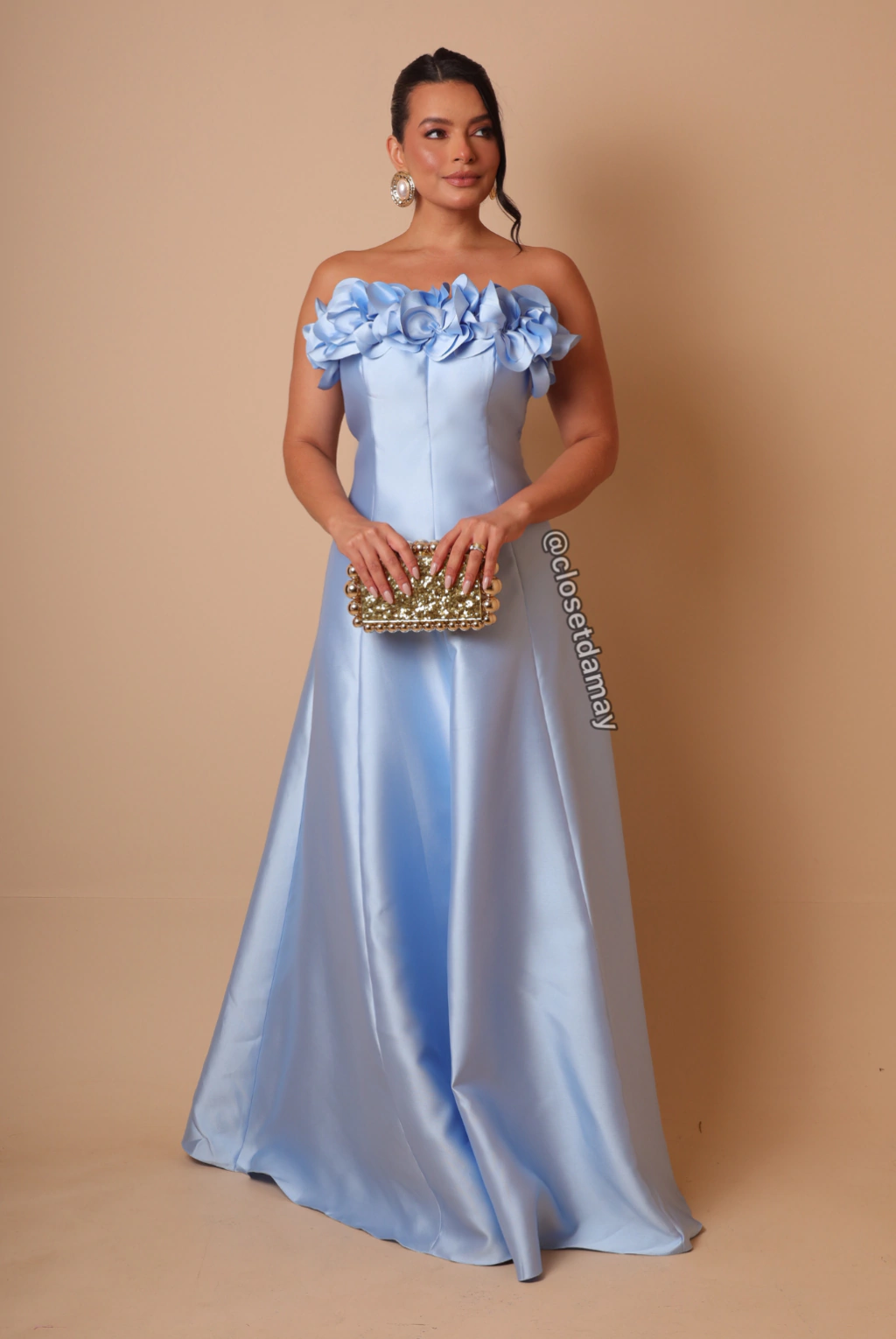 Vestido de festa longo, tomara que caia com aplicação de flores 3D no busto e saia evasê.