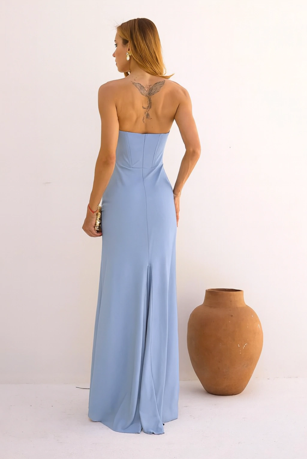 Vestido de festa longo, tomara que caia corset bem estruturado e harmonial, nó fake com detalhe drapeado ao redor e fenda que transmite sutileza e elegância na peça -