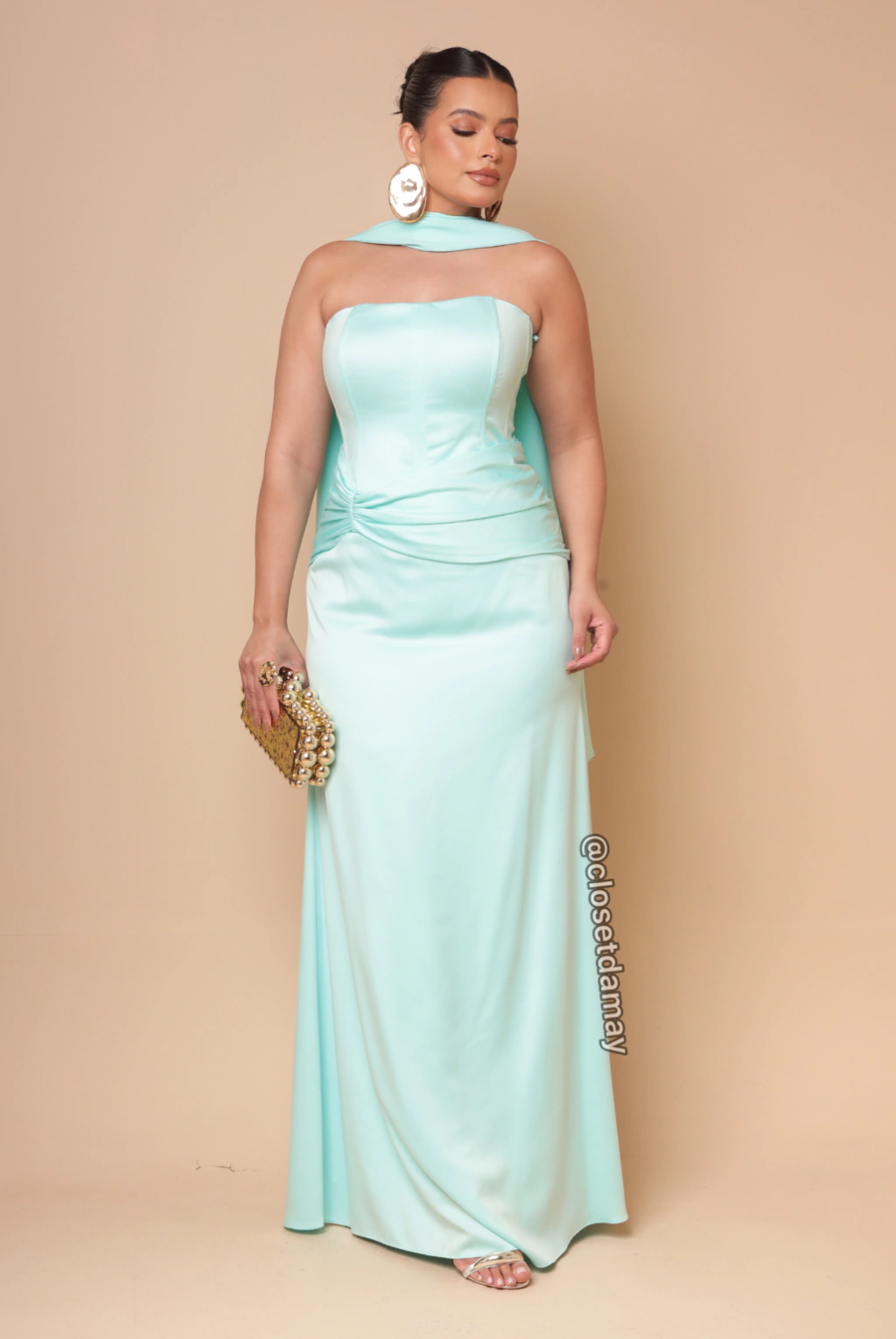 Vestido de festa longo plus size, tomara que caia, em crepe acetinado, drapeado no quadril e echarpe removível. Possui bojo, forro e zíper.