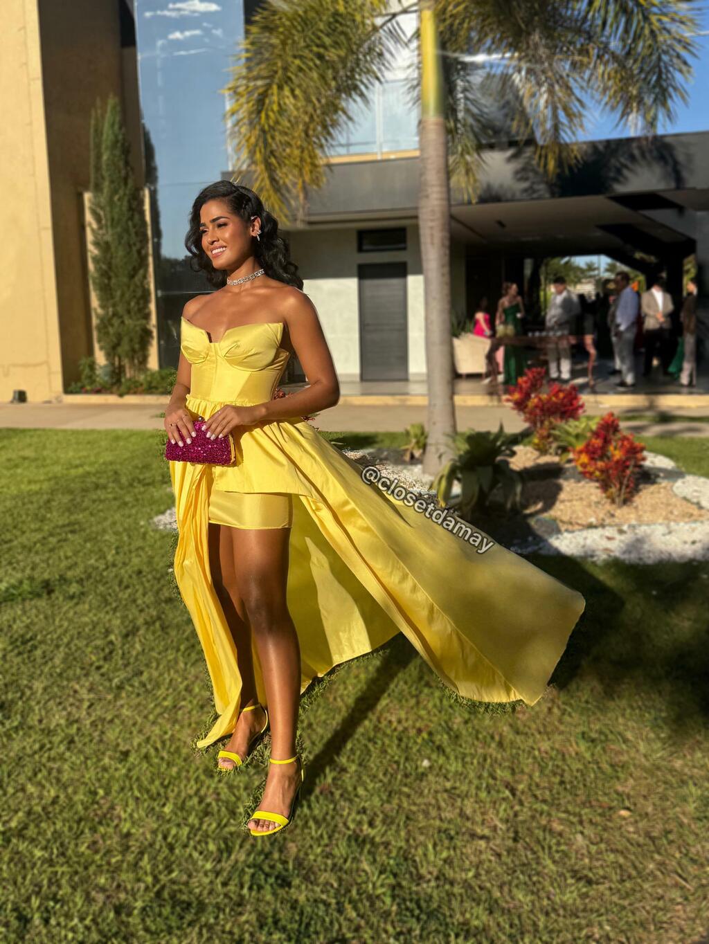 Vestido de festa longo, tomara que caia, decote coração, busto estruturado e fenda - Amarelo