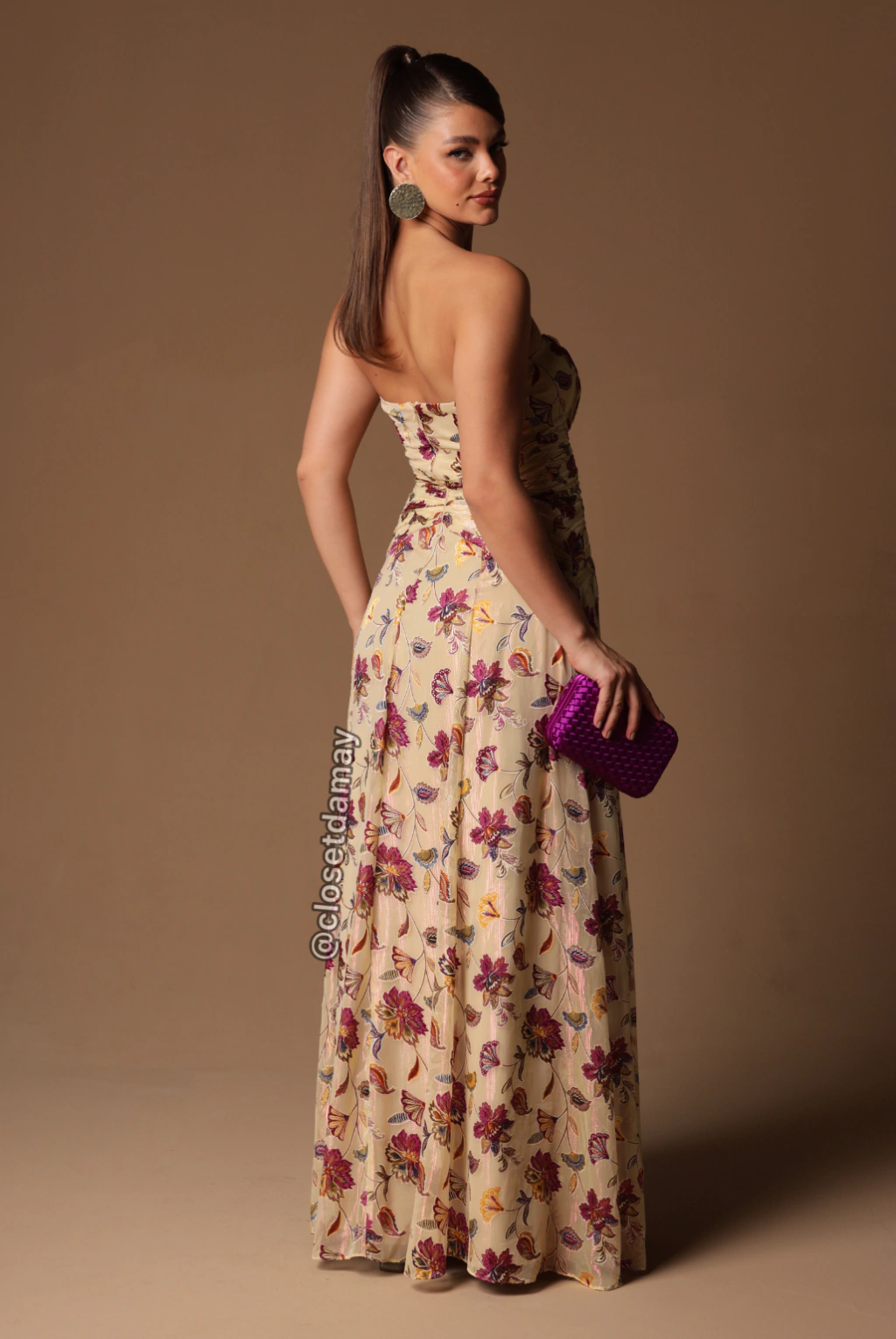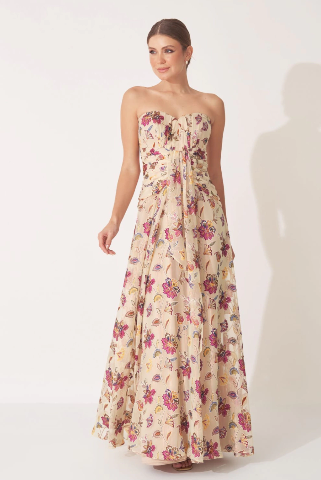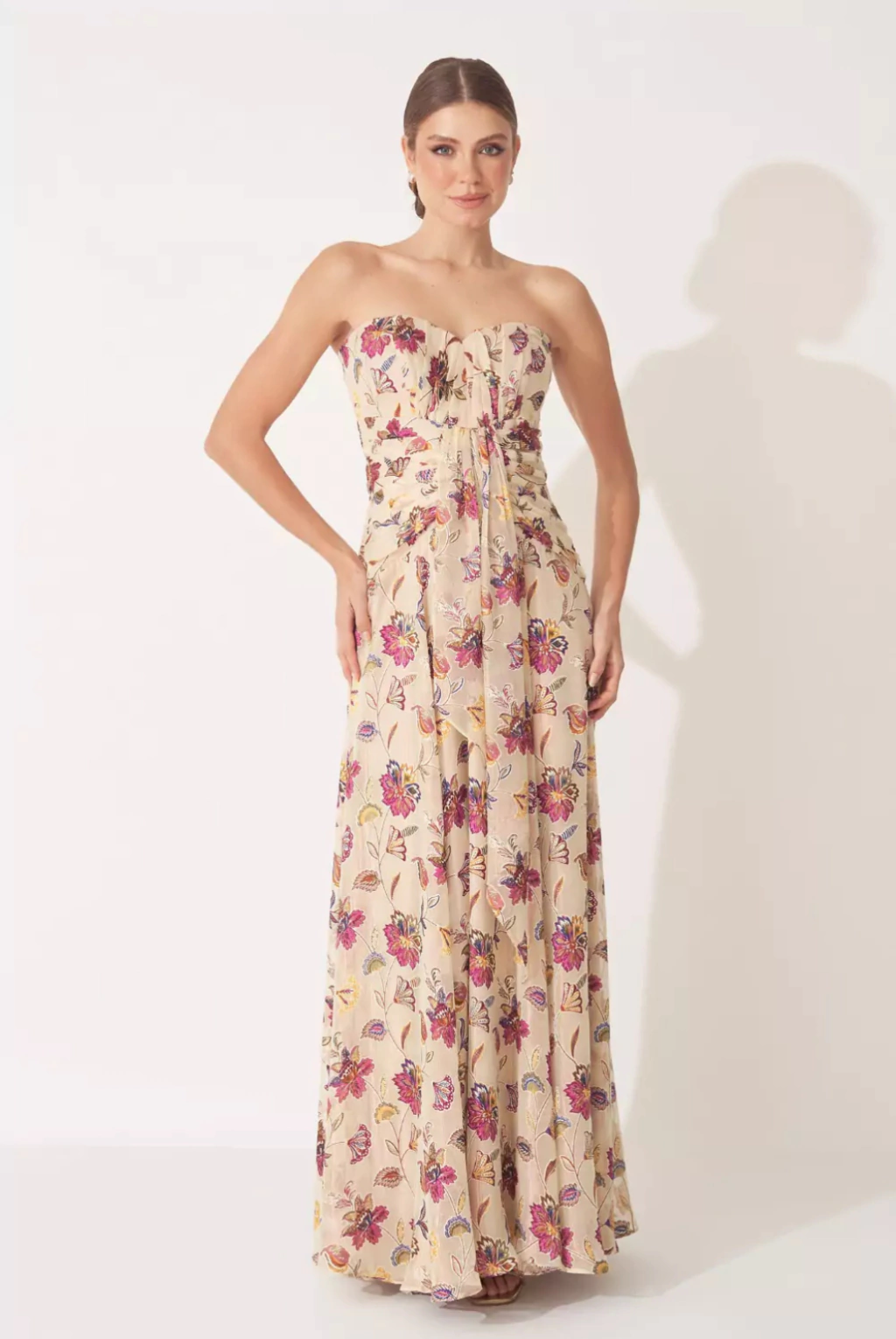 Vestido longo em viscose devorê estampada, leve e sofisticado. O decote coração sem alças valoriza o colo de forma romântica, enquanto o franzido no centro da cintura garante caimento elegante. A faixa solta com ponta assimétrica adiciona movimento e um detalhe fashion ao look. A saia solta transmite fluidez, complementada pelo franzido nas